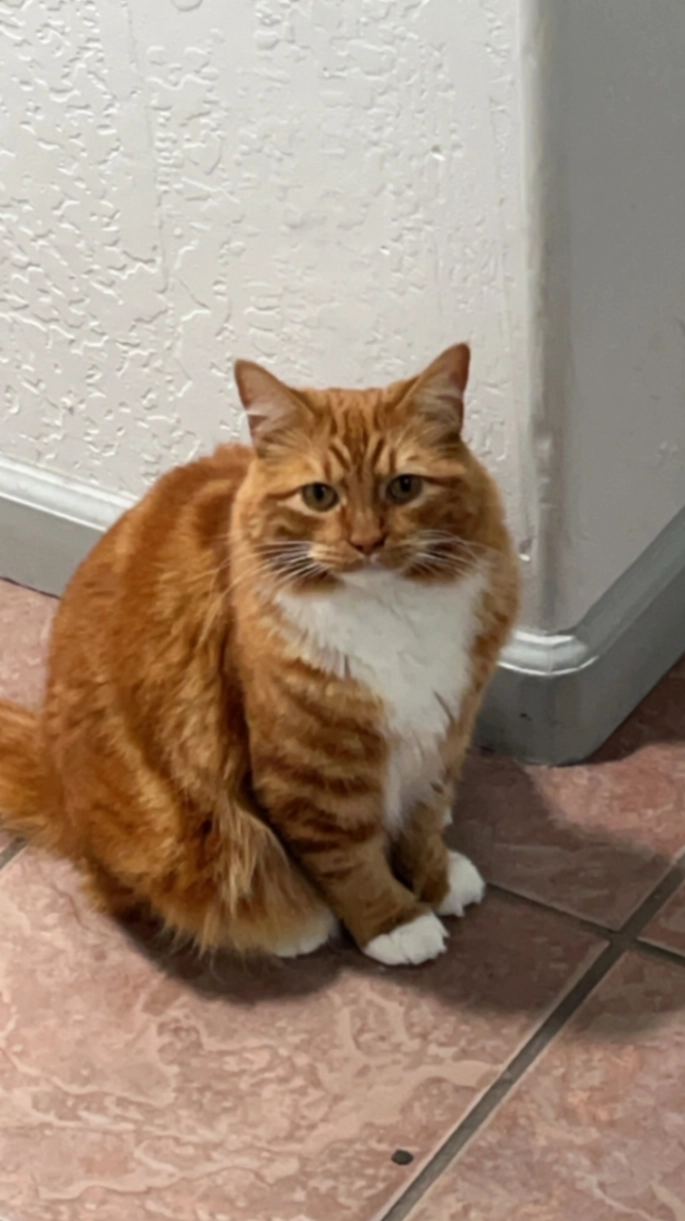 He’s a very scary cat. He will run at any sudden noise. He’s also on the chubby side and he has white fur on his stomach. He also has pretty long nails.