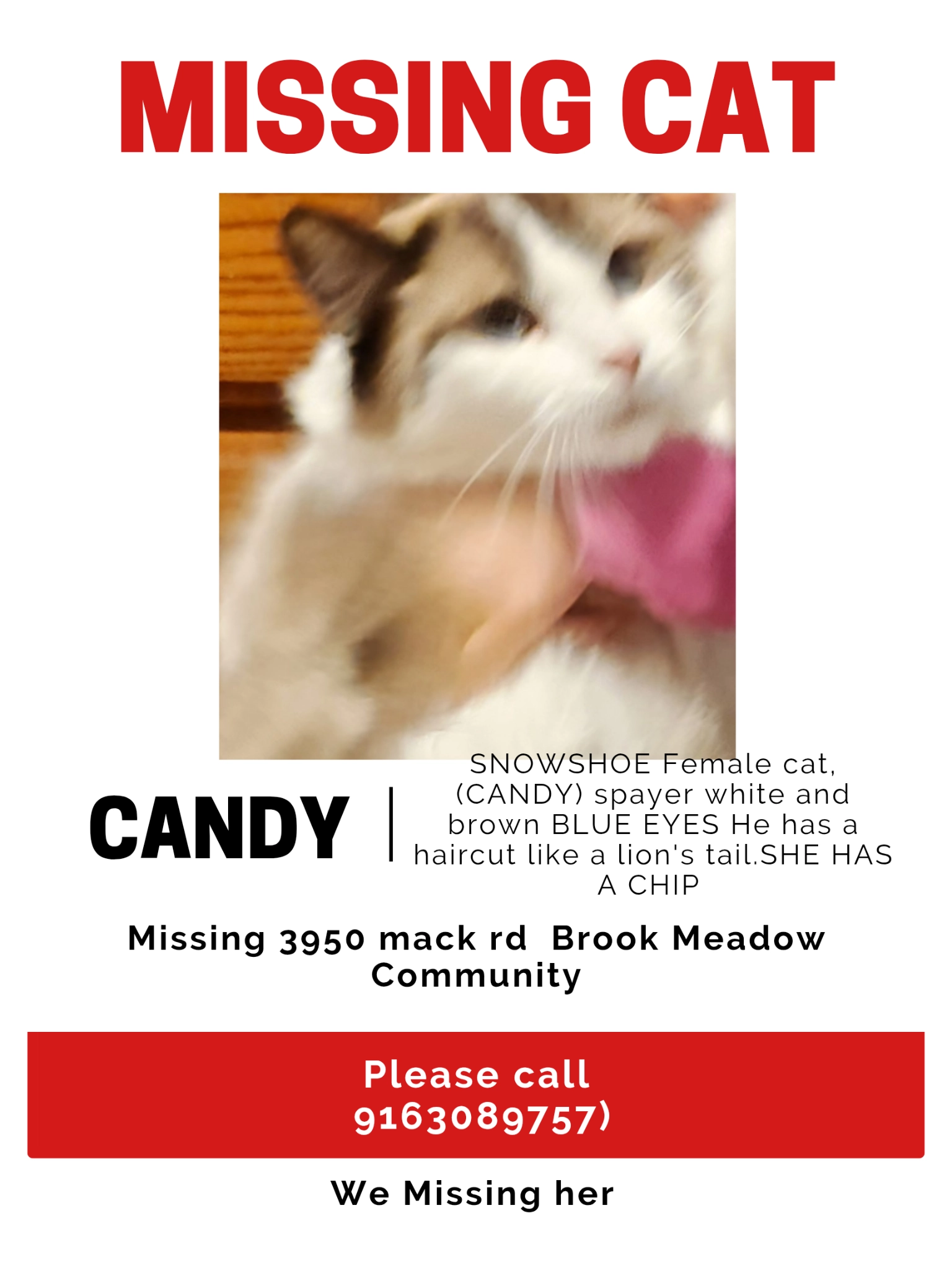 Pika is a well loved 6 year old calico with white paws and chest. She spayed and chipped. She is a bit skittish. She is very missed.
