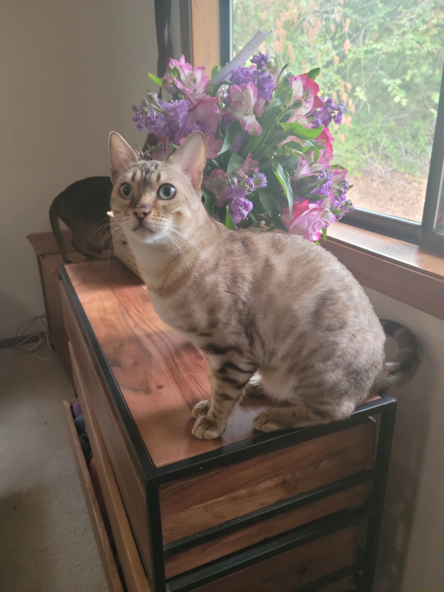 3 year old neutered male Bengal cat, light blue eyes, microchipped, very active, vocal, shy with strangers, beautiful silky coat with glitter, off white/light beige with pale brown spots.