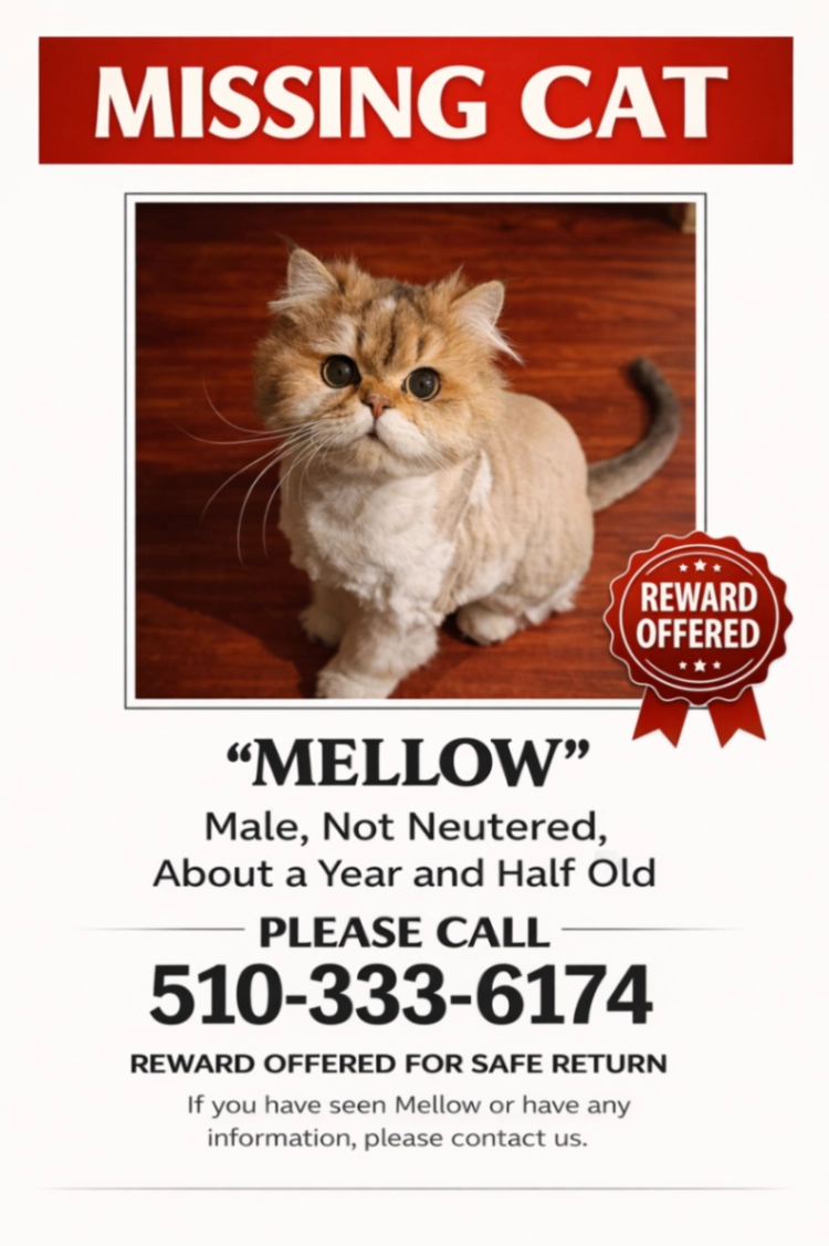 Have you seen Mellow? Please help us by checking your garage, attic, shed, and outdoor spaces.