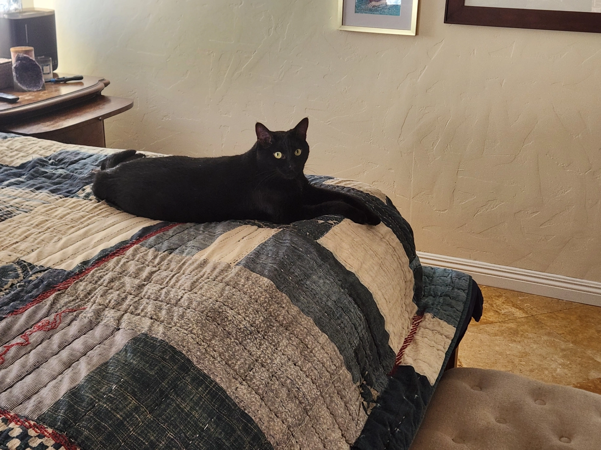 All black short haired polydactyl / medium weight/ wearing a black collar with diamonds / 7 years old