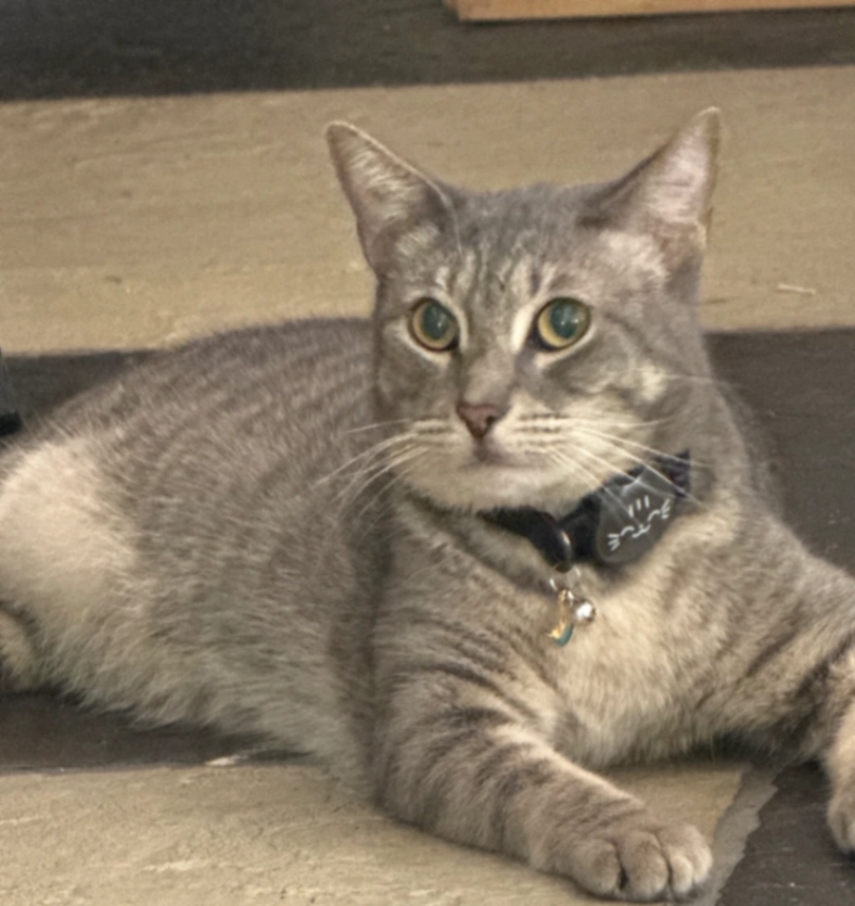 Jack is a gray (blue-gray) short-haired tabby with faint striping and dark rings on his tail. He has yellow-green eyes, a lean medium build, and was wearing a dark/black collar when last seen.