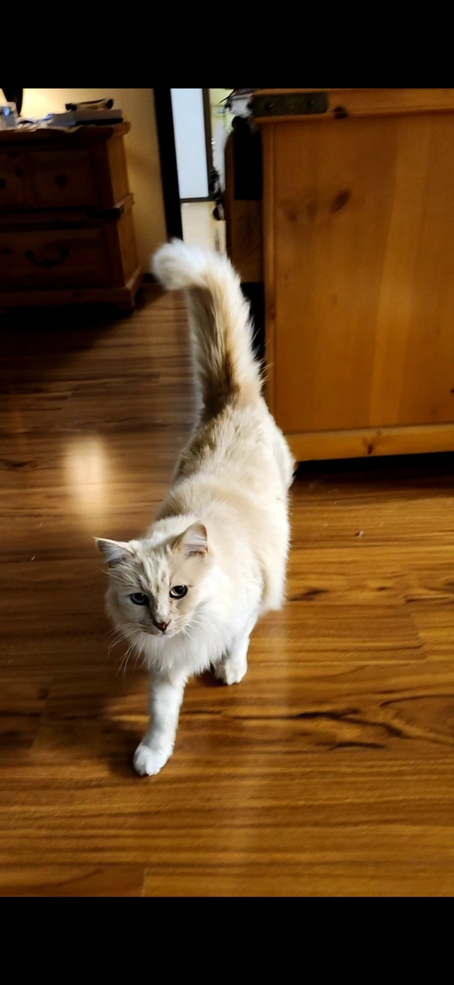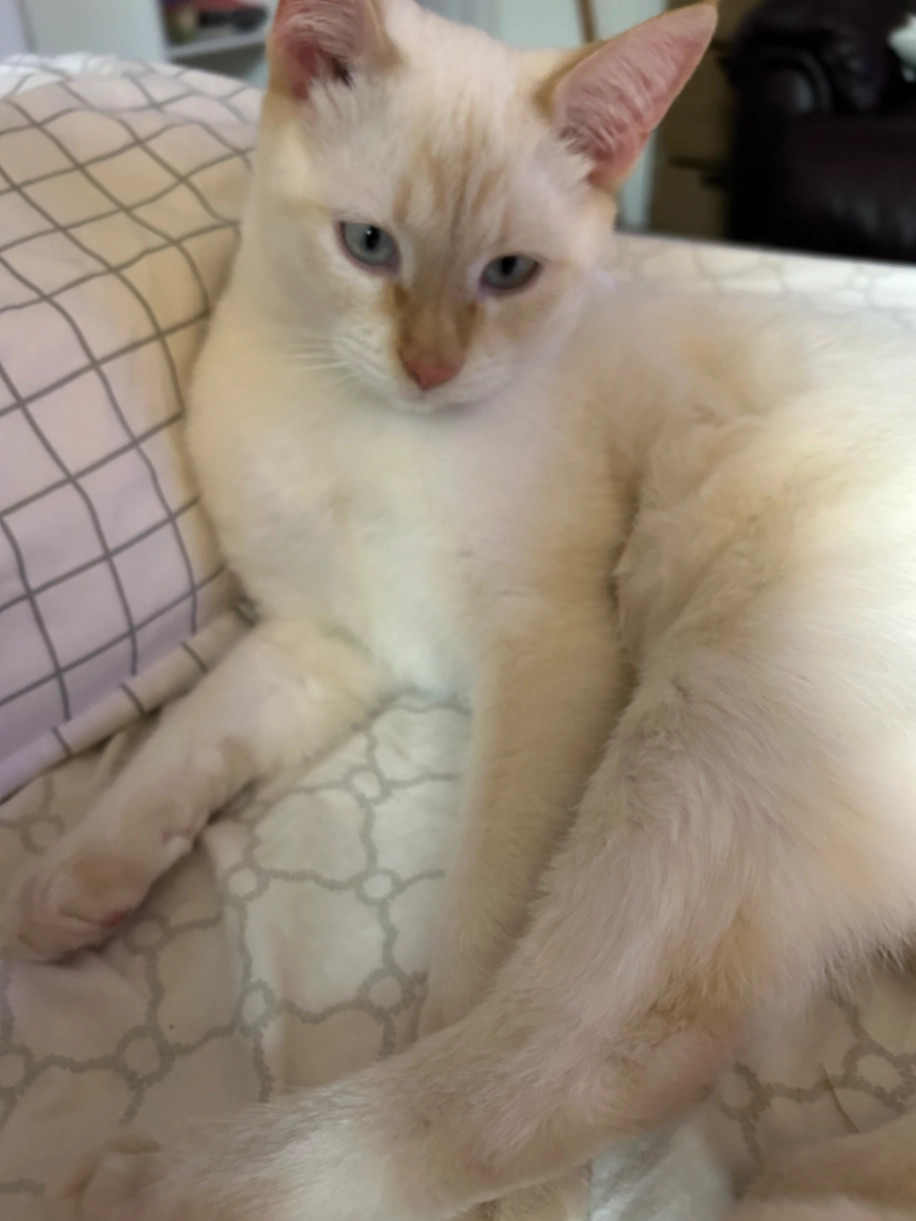 Sunny is white with very light orange shading on his back and face and tail. He’s never been outside so he might be shy.