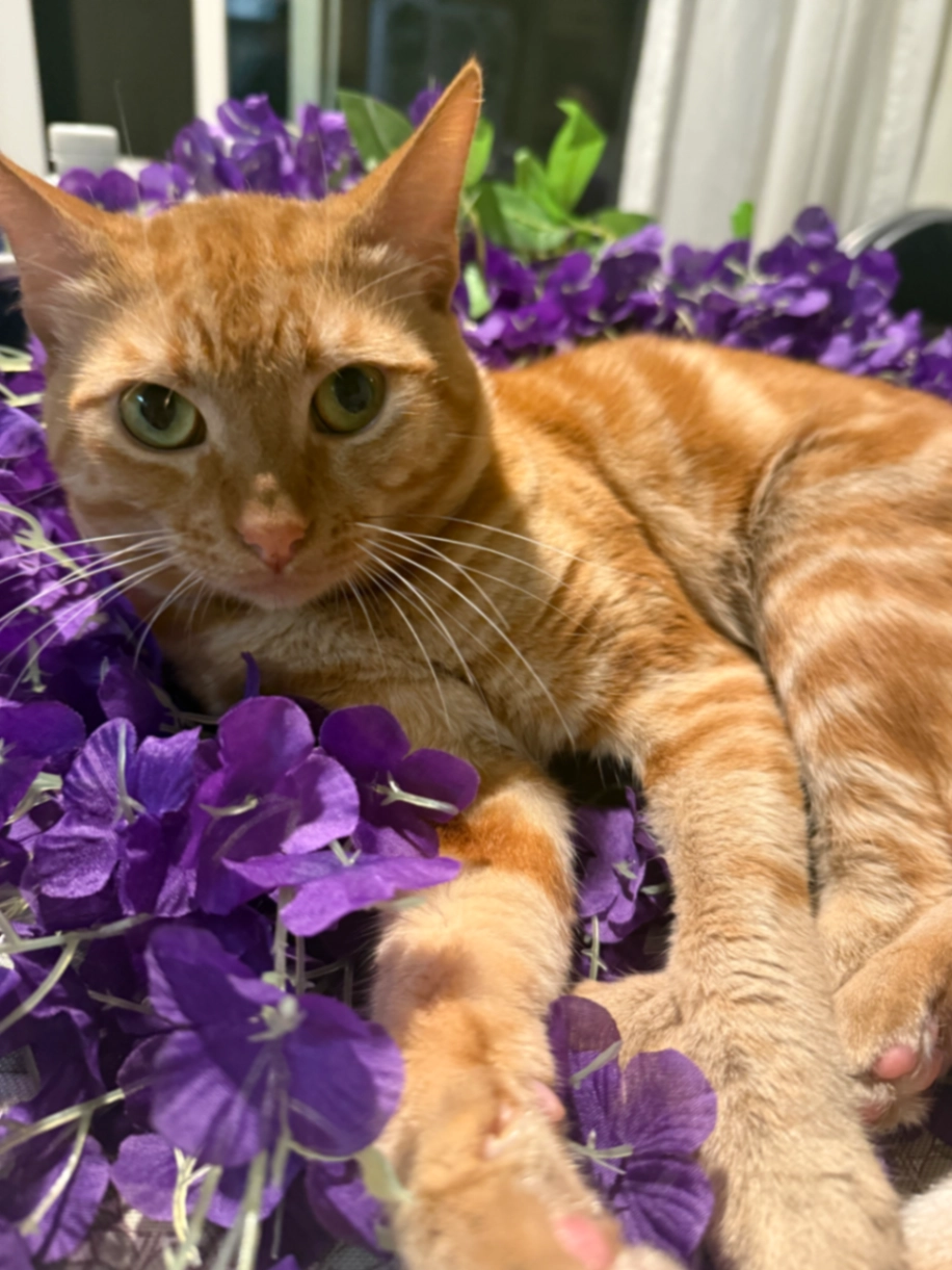 He’s an orange cat who isn’t neutered. He is a very shy cat will freeze then run away from other people.