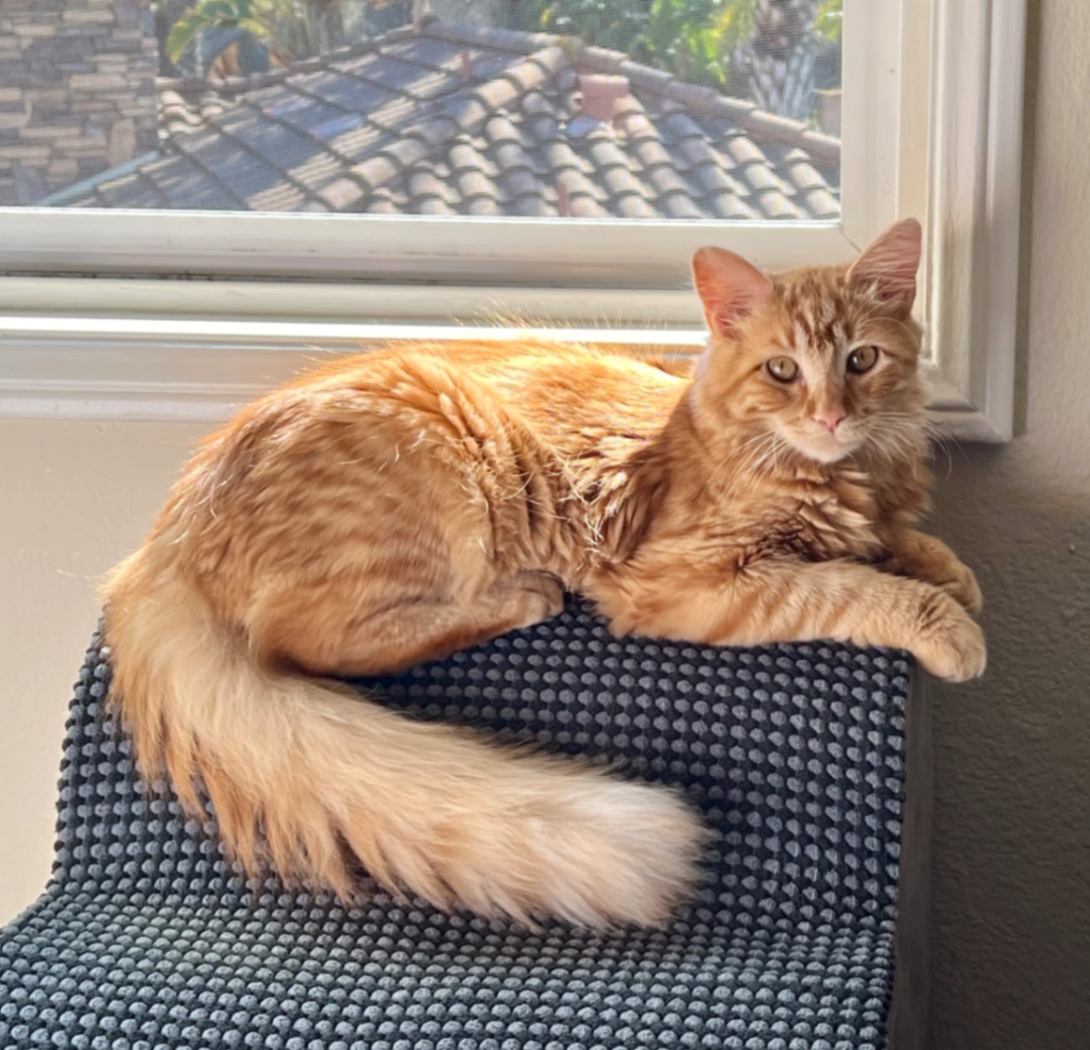 Extremely shy, scared, unsocialized 6.5 neutered orange tabby kitten with fluffy tale lost in Del Mar Heights. Reward.