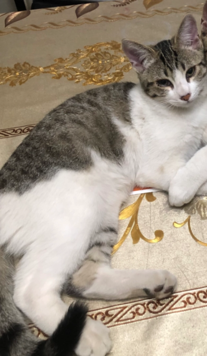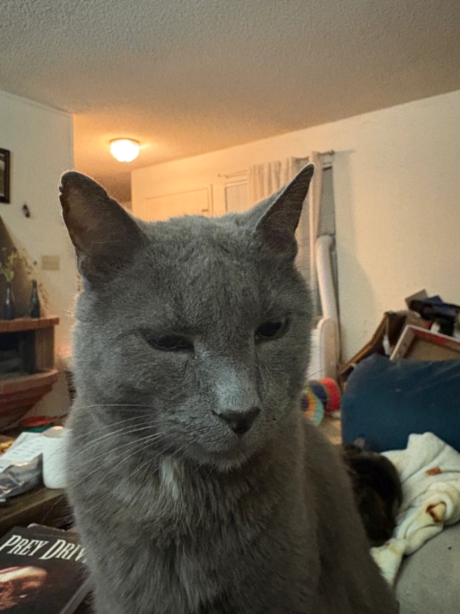 Owen is a 15-year-old domestic short hair. He is all gray with a white patch on his stomach and upper chest. He is missing a small chunk on his right ear.