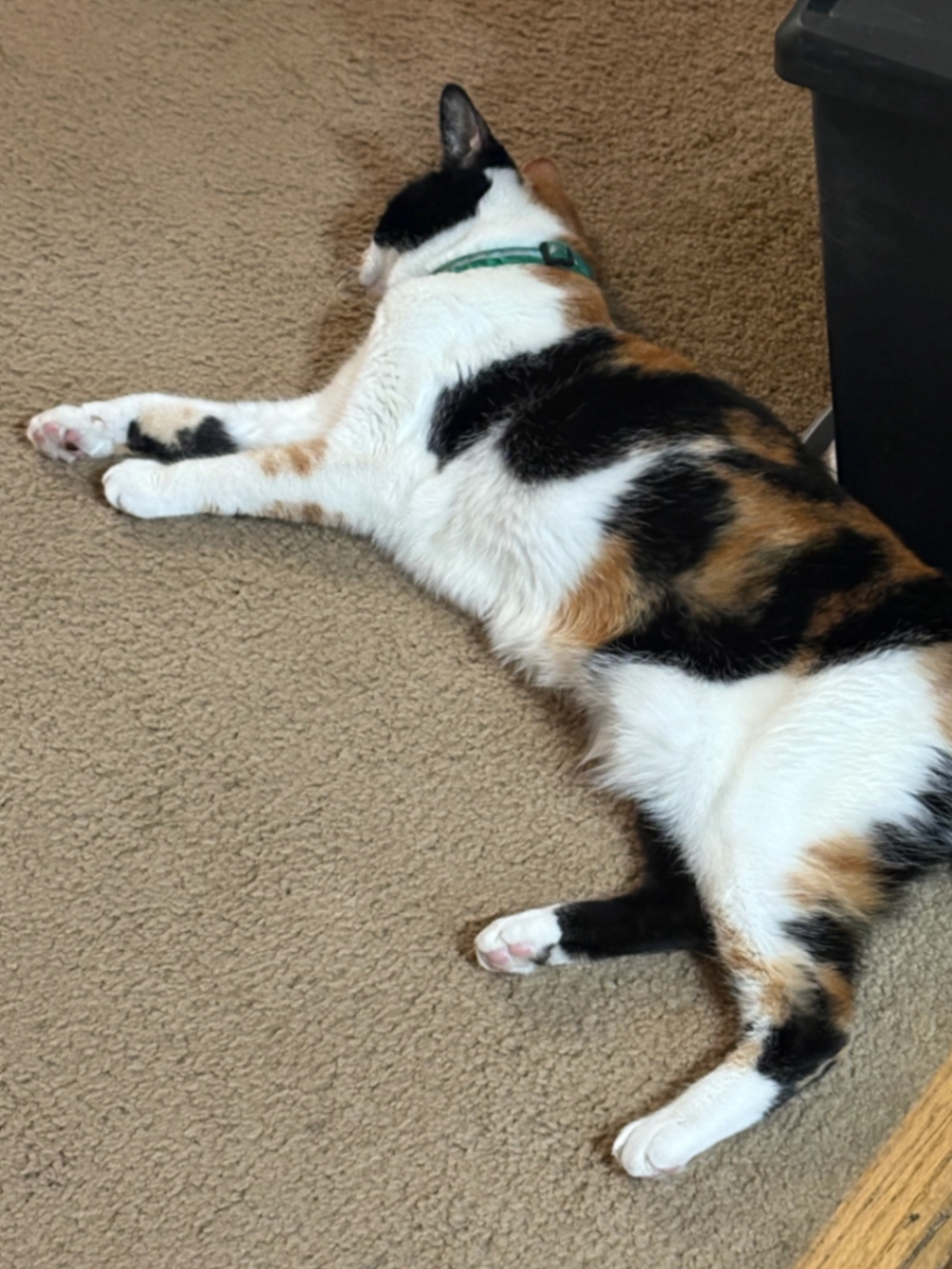 12 year old Calico wearing a pink collar and requires thyroid medication