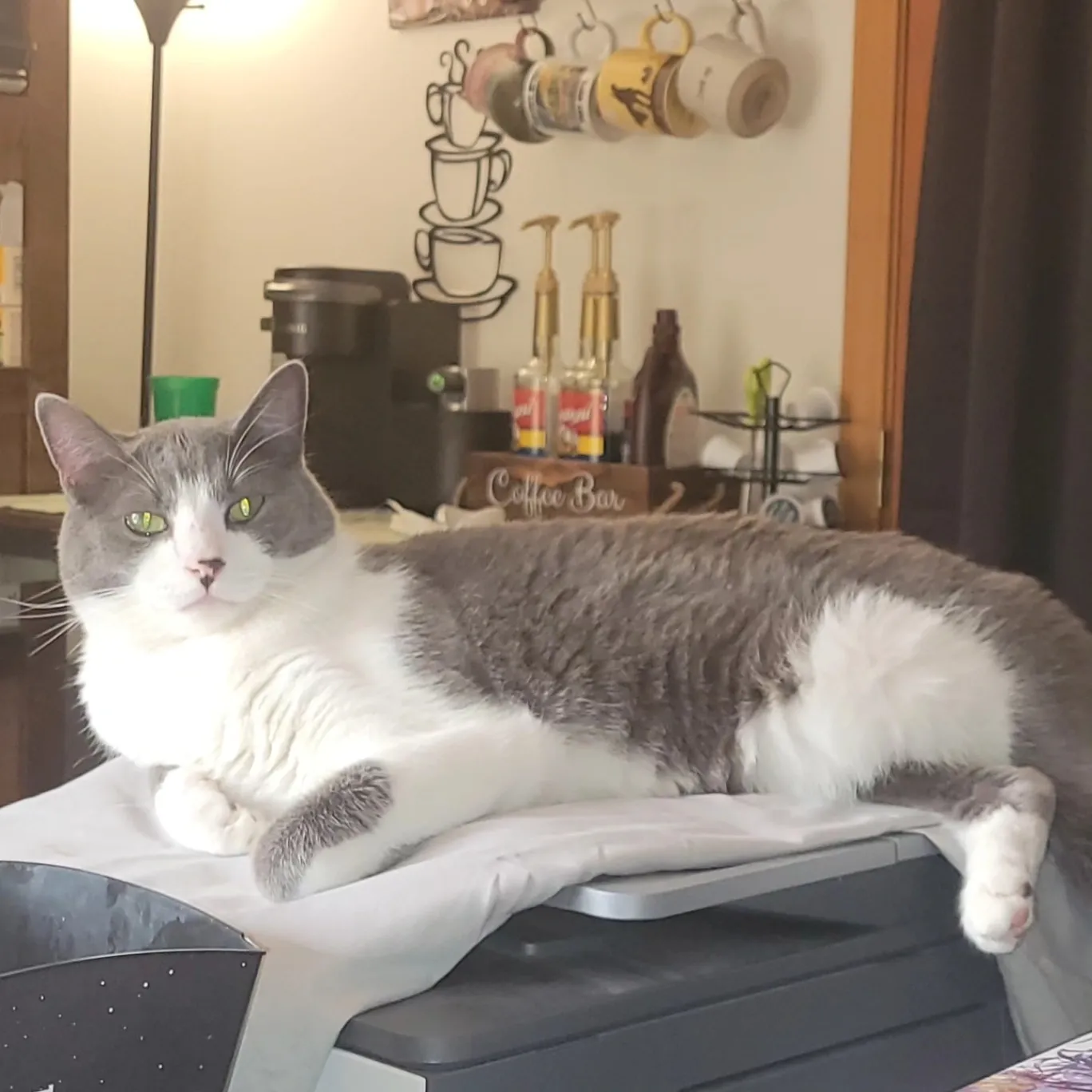 Yes black and white longhaired with a fluffy tail big yellow eyes and big white paws