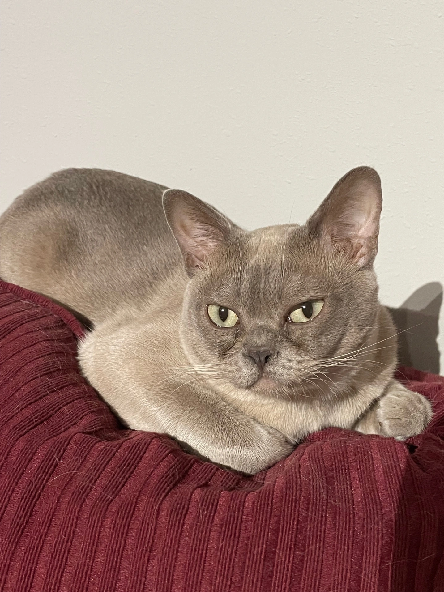 Medium sized and stocky gray cat. Very friendly, very quiet meow