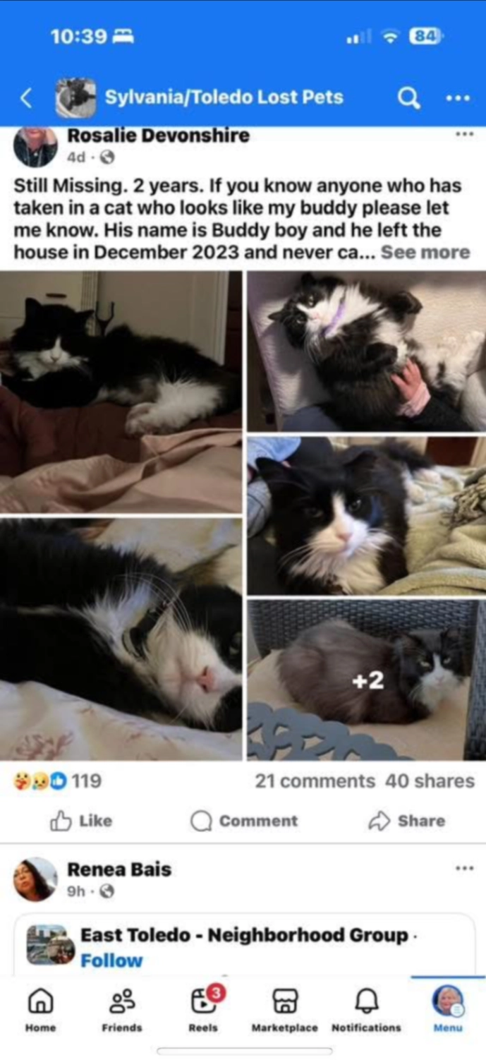 LukeyReunited after1w, 4dA great avenue to spread the word & many people reached out with cats that looked like him & offered tips & prayers for us to be united. He showed up at my patio door 3:30am this morning after being missing 15 days & nights.