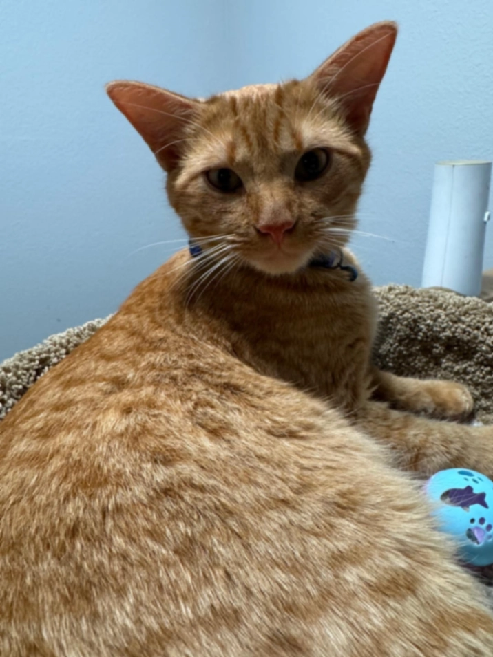 Orange colored, has a blue collar with bell on.