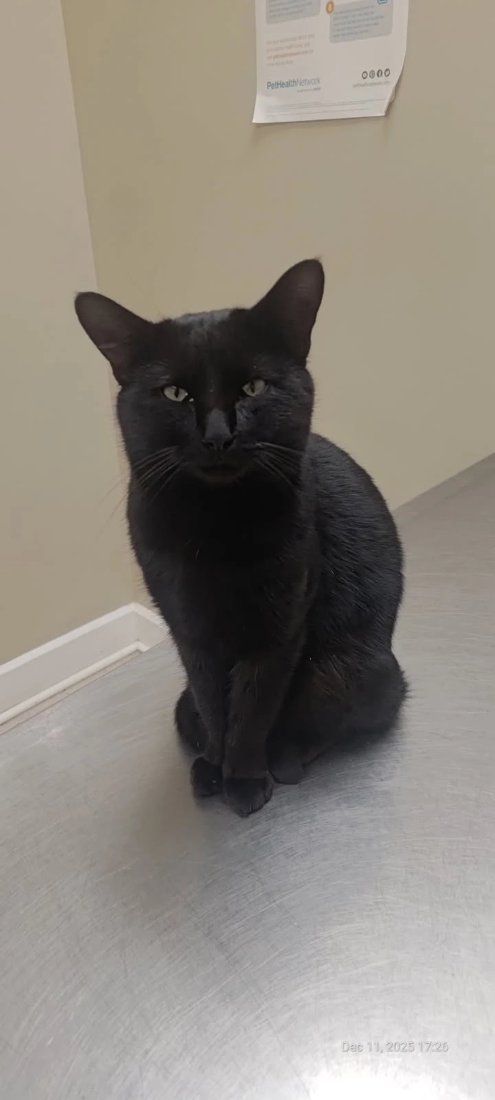 Approximately 3 yrs old small frame, black with white small patch on chest. Stomach has white hair with black mixes in. Eyes green.