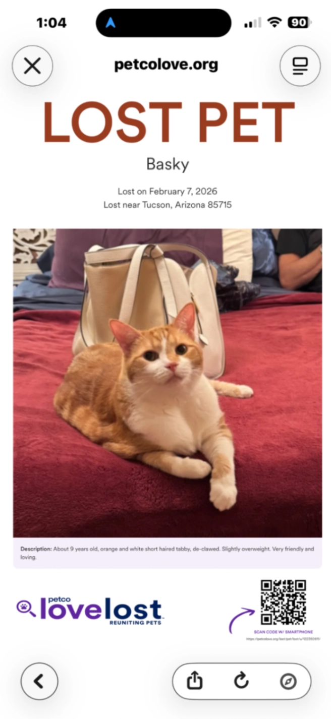 Male orange and white tabby, about 9 years old, about 15 lbs. very cute and very friendly. Lost since February 7, 2026 in Tucson Country Club area.