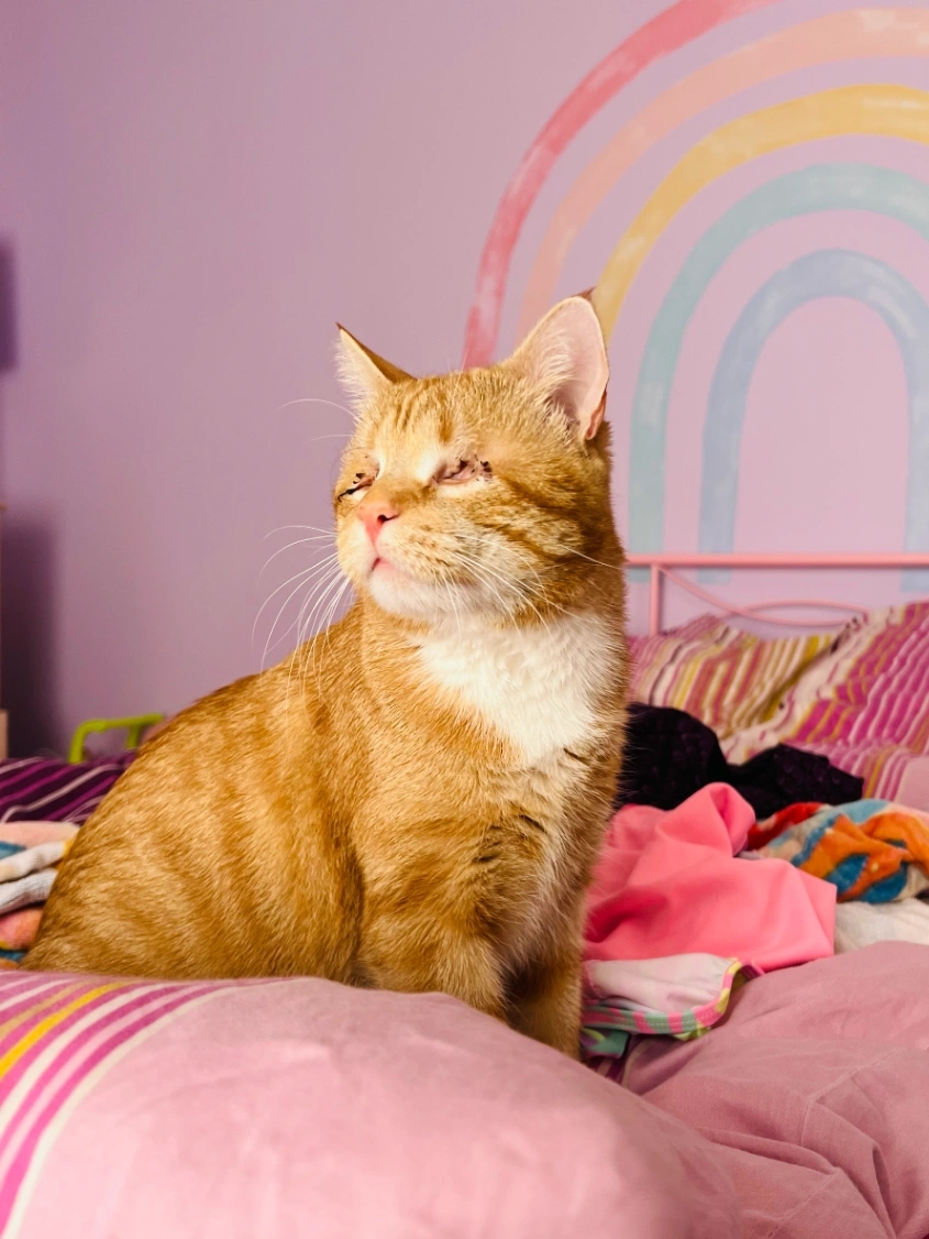 Male, long tail, short hair. About 3 years old, and 13 lb. His name is FINN and he is 100% blind. Missing both eyes, but in good health otherwise, very capable.