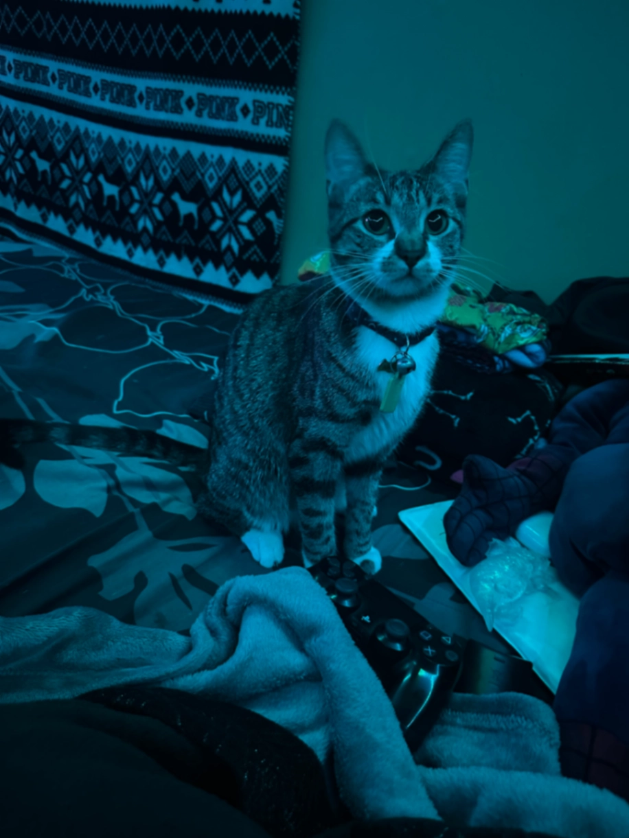 She is very friendly she is kinda small she has a blue star and moon collar with a bat name tag that says mamas aka fat ass she LOVES treats
