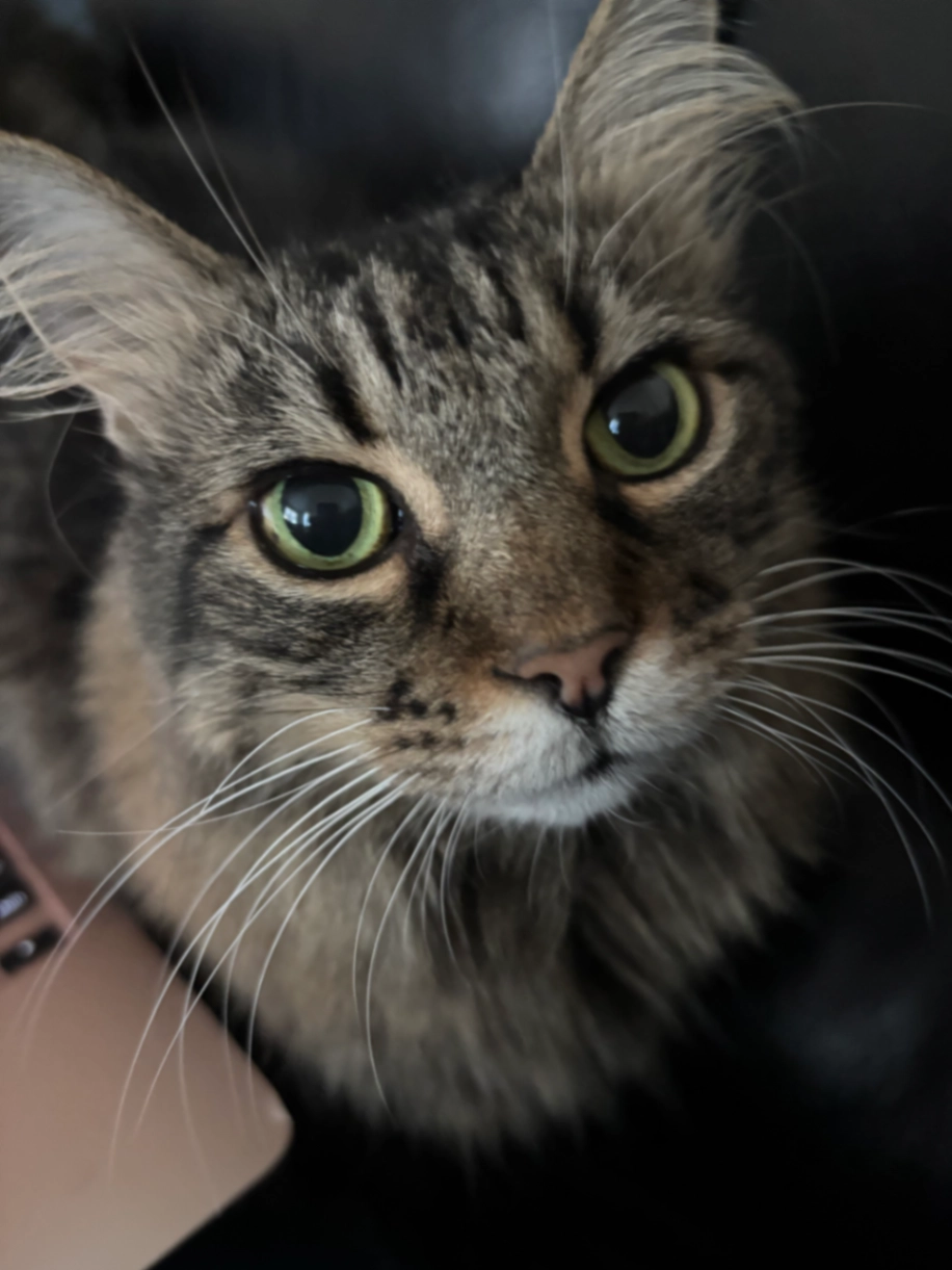 Tasha is a black and brown tabby with long fur and tufted ears. She isn't wearing her collar, but is microchipped. She is afraid of people.