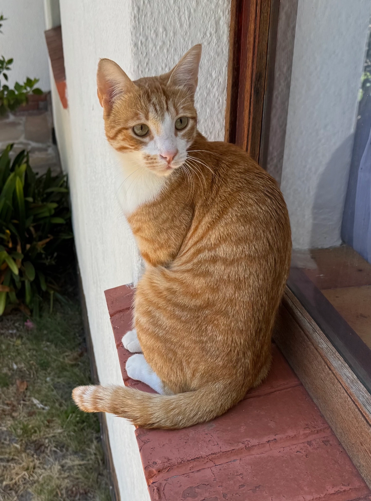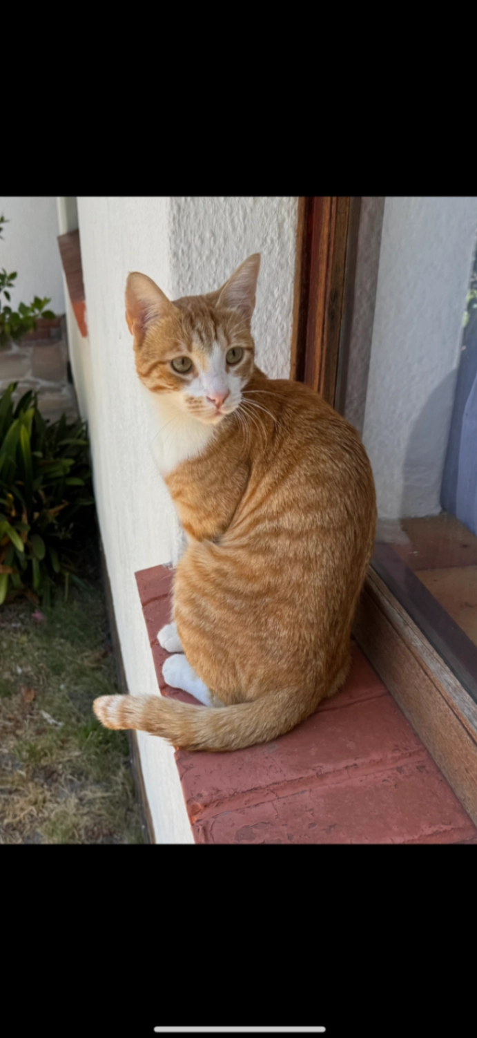 He is a stripped ginger cat. He has green eyes and an identifiable white patch on his back right leg. He isn’t wearing a collar but is microchipped. He just turned a year old and still displays kitten tendencies.