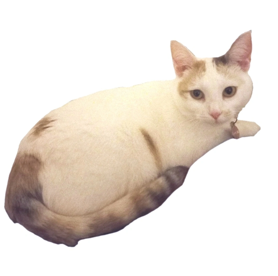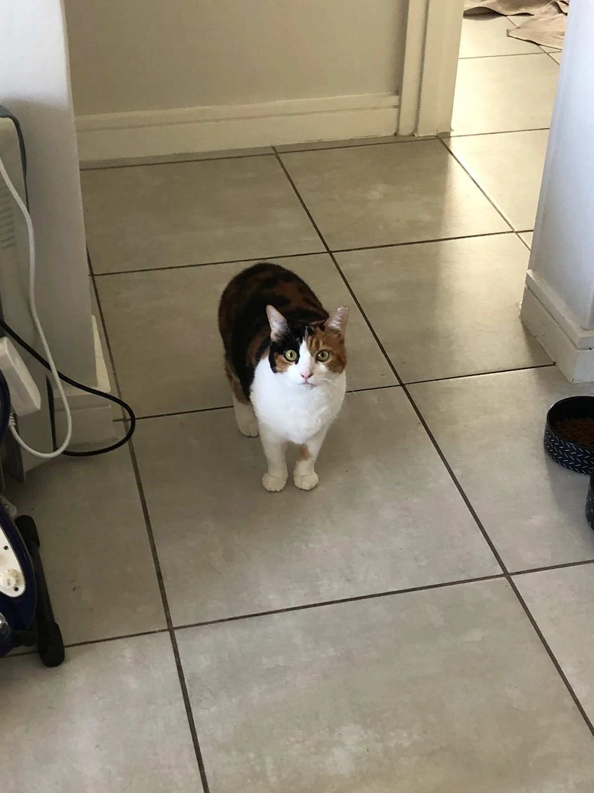 Calico cat, kind of fat. Brown, black and white coat. Very shy