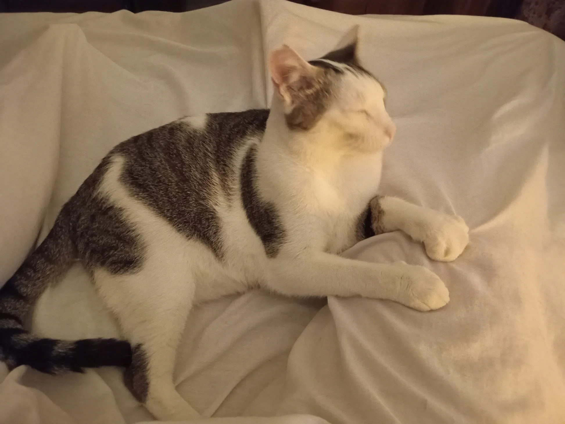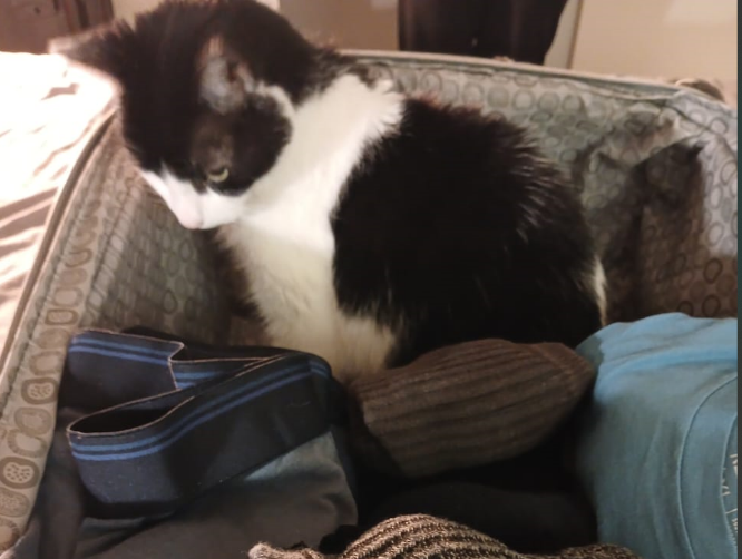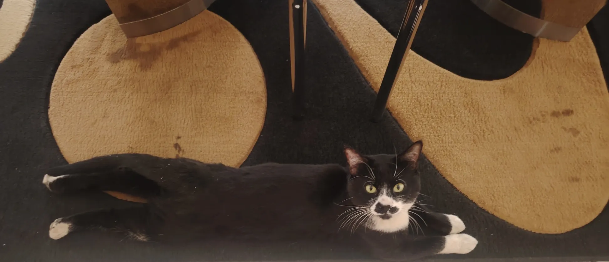 Tuxedo with specific markings and a pink nose and white whiskers