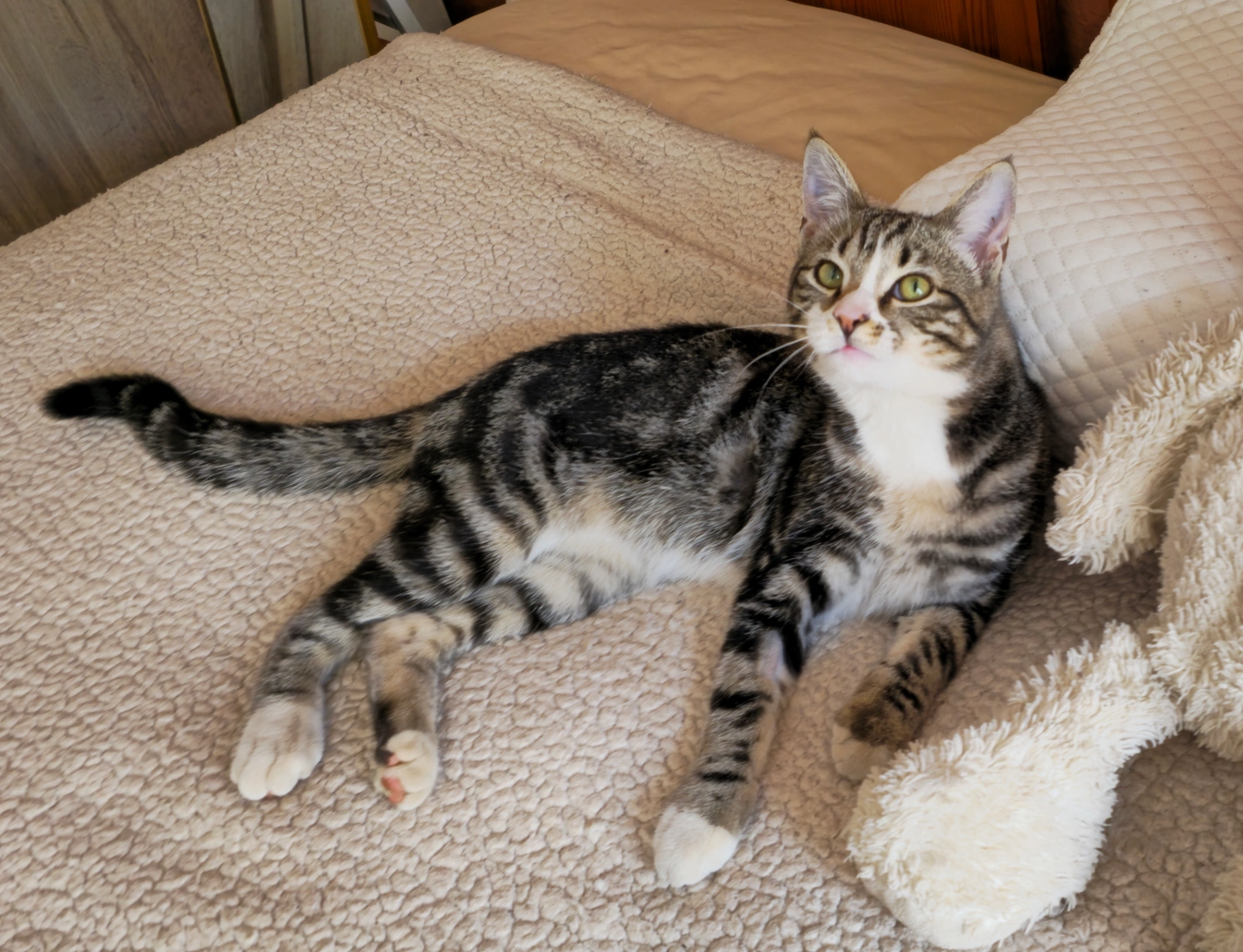 Tapioca (responds to Tappy) is a young brown, white and black striped Tabby cat. He is around 2 years old, has green eyes, a white chest, white paws and has a brown spot on his cheek.