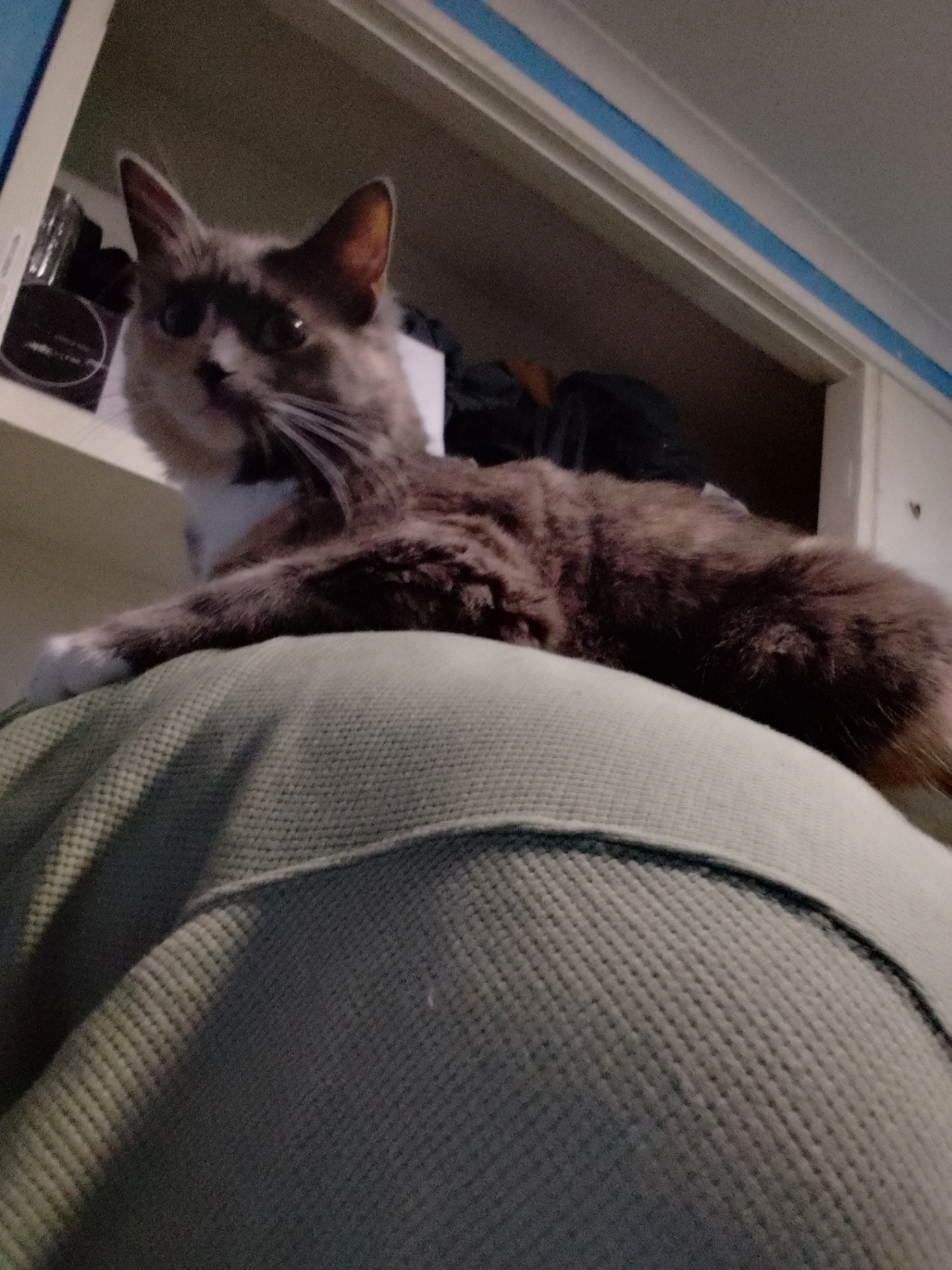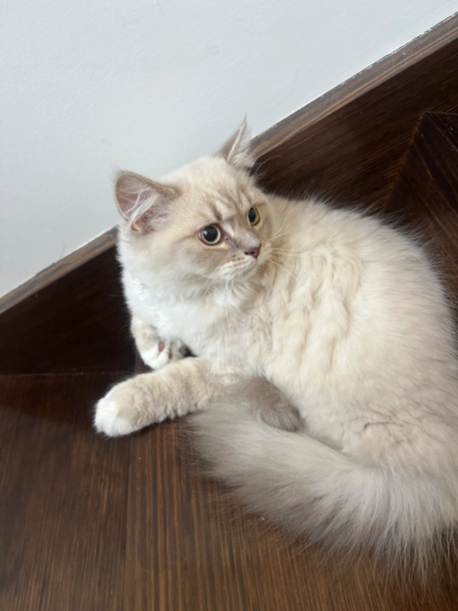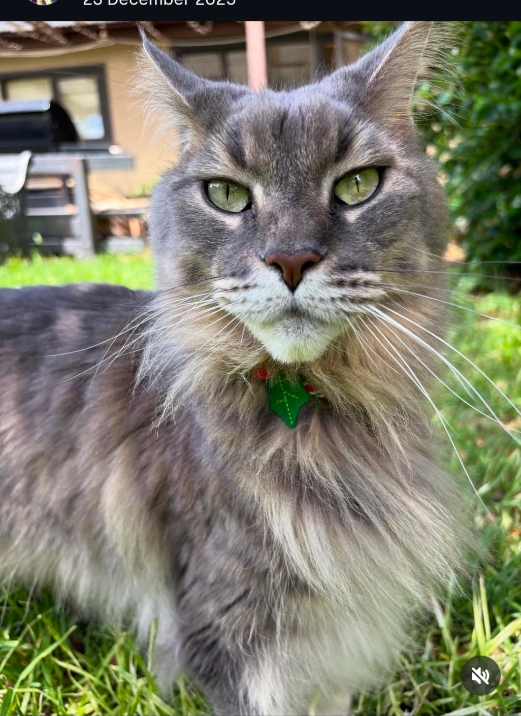 Minnie is a grey, long haired Maine Coon. She's friendly but is likely to be scared as she's an inside cat