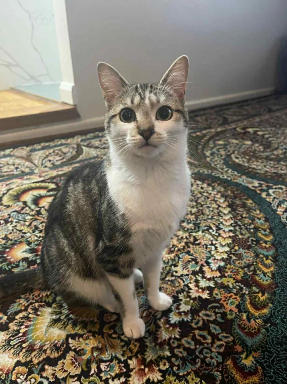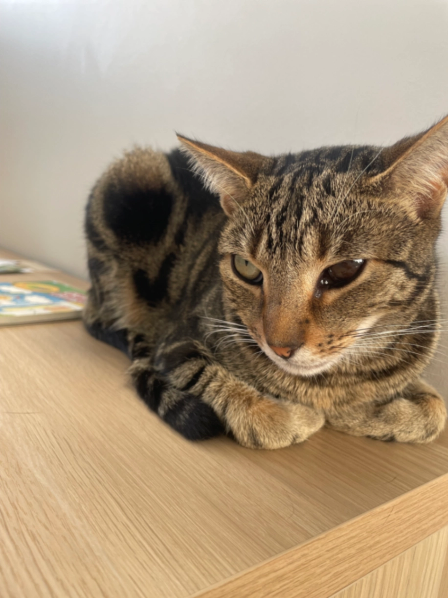Basil is a small tabby cat with scarring over one eye, which makes the eye look completely brown. He is quite skittish and likely wont respond to his name when called.