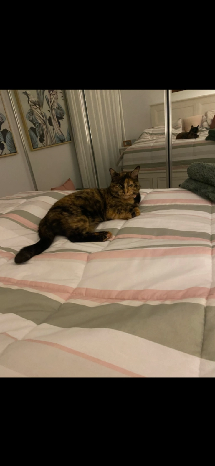 Female tabby. Normally very friendly and easy to approach and pet. Tolerates being held for short periods. Answers to a tsking sound as it indicates raw meat feeding.