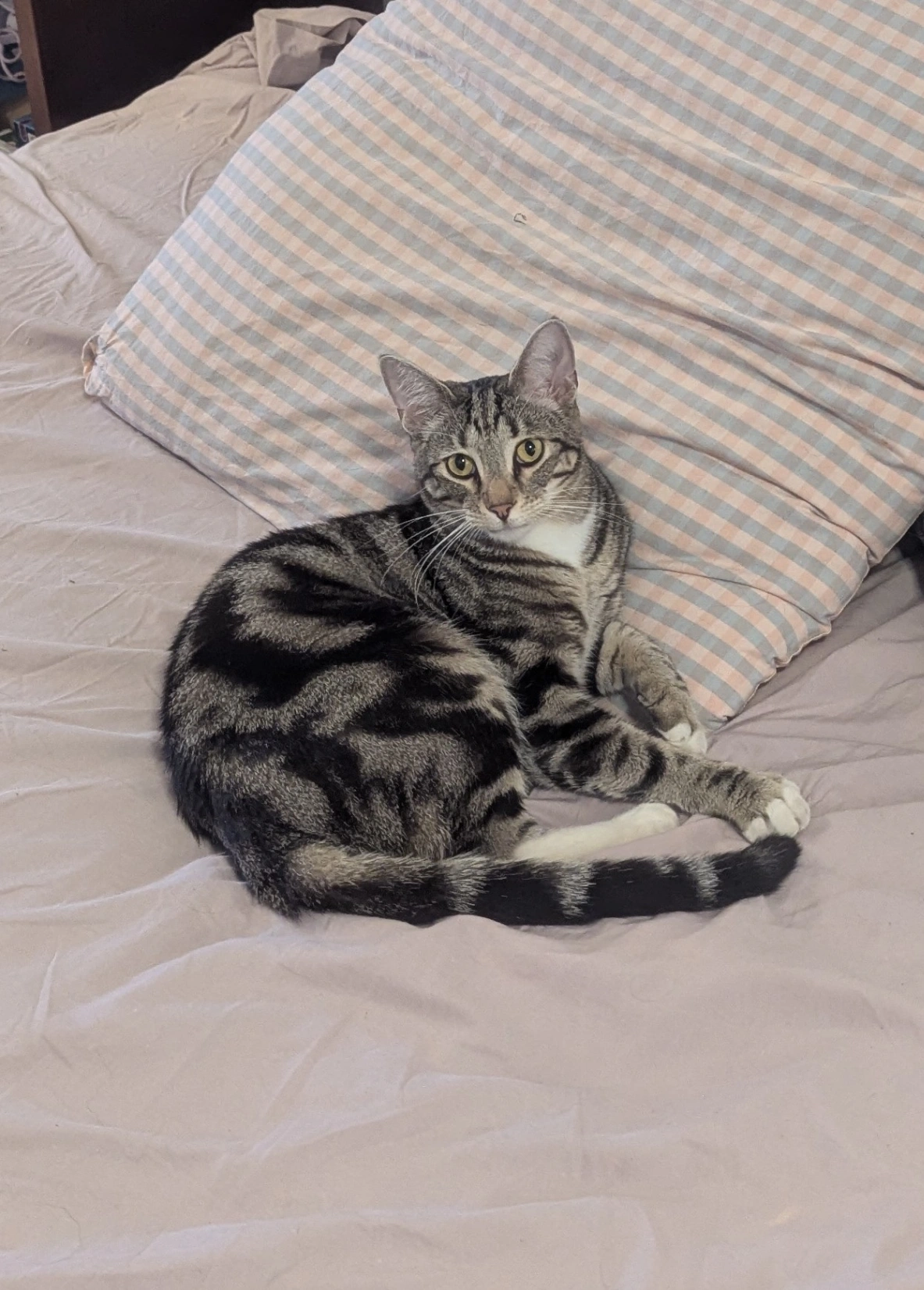 Ernie has stripes, white underside, pink nose and yellow eyes. He can be very shy and responds best to voice, he's not very food motivated.