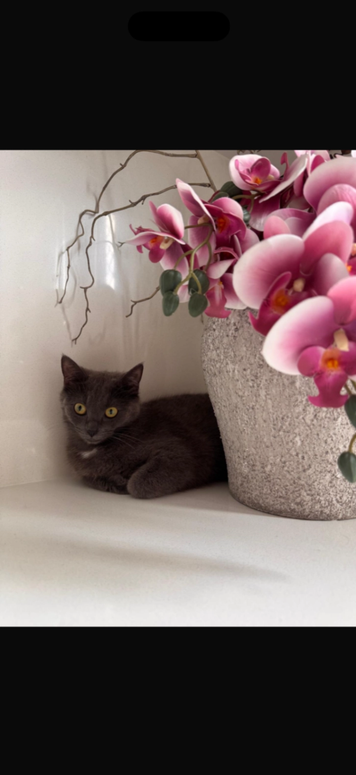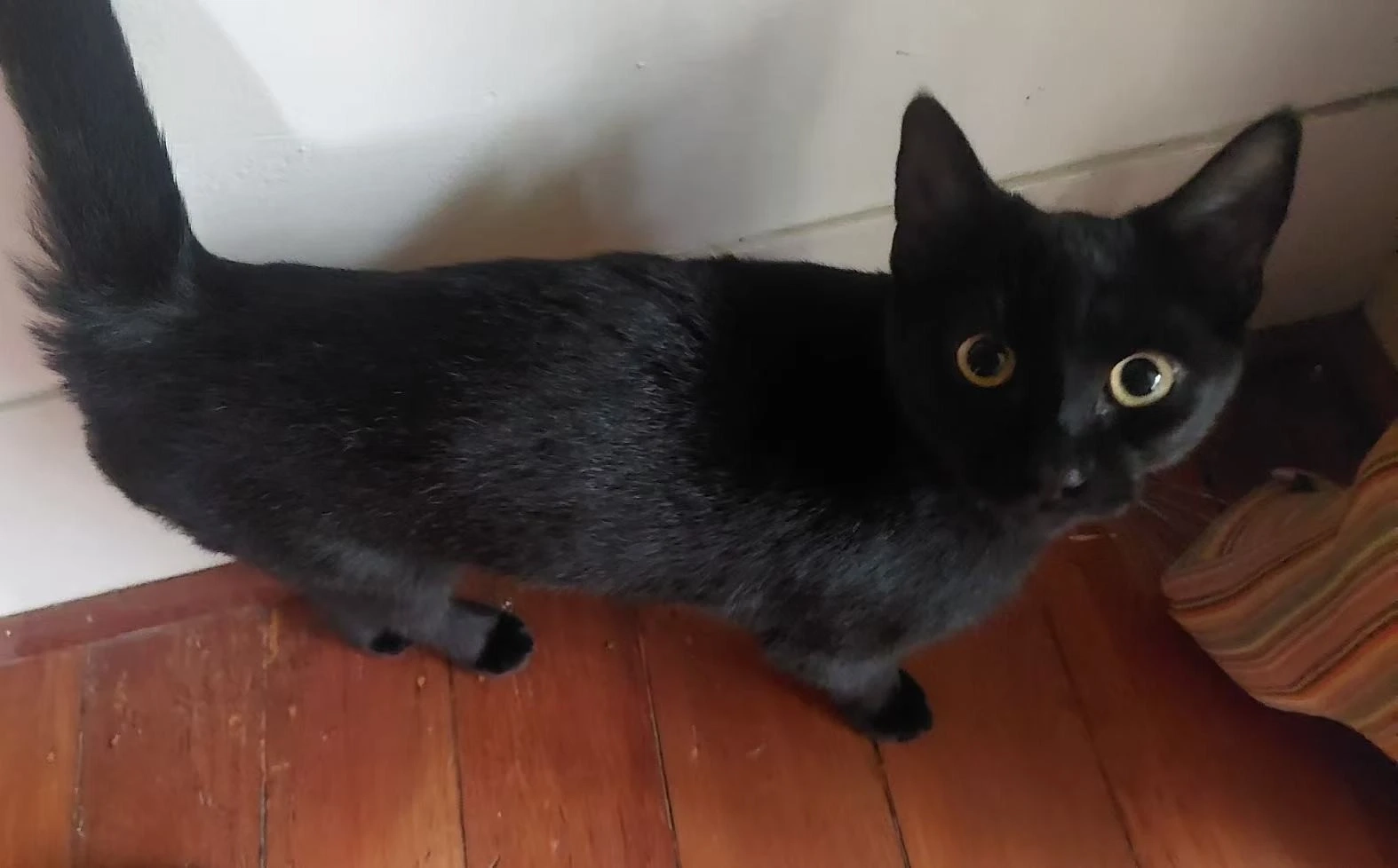 6 months old, all black domestic cat, slim body, yellow-green eyes, with a Grey-blue breakaway collar, Desexed, microchipped, friendly and gentle.