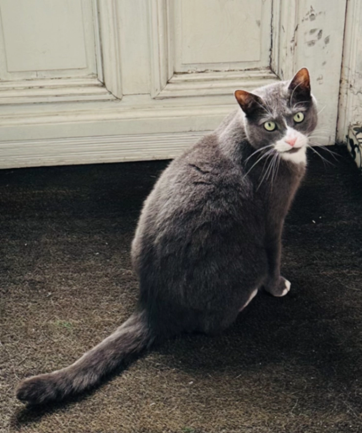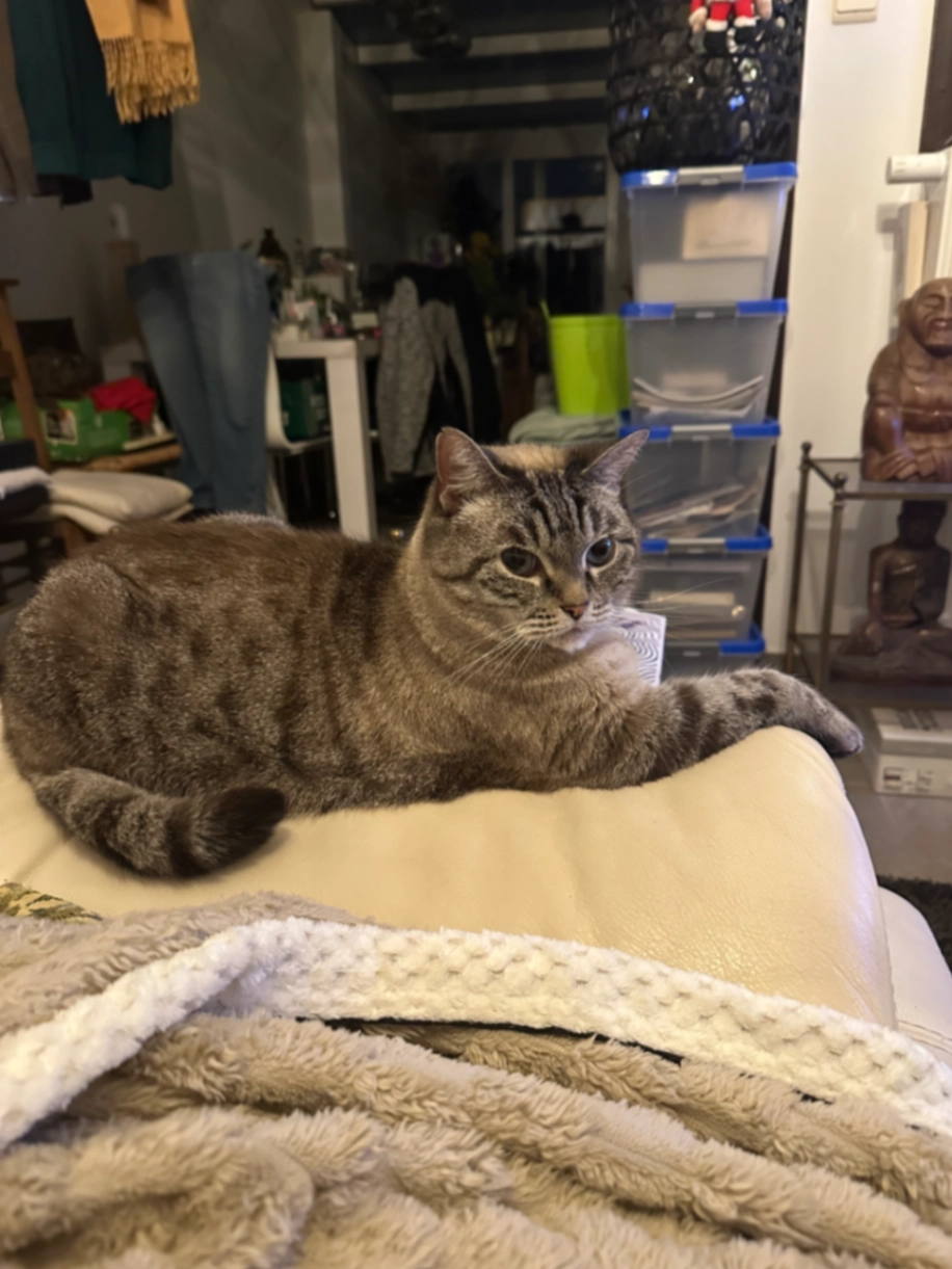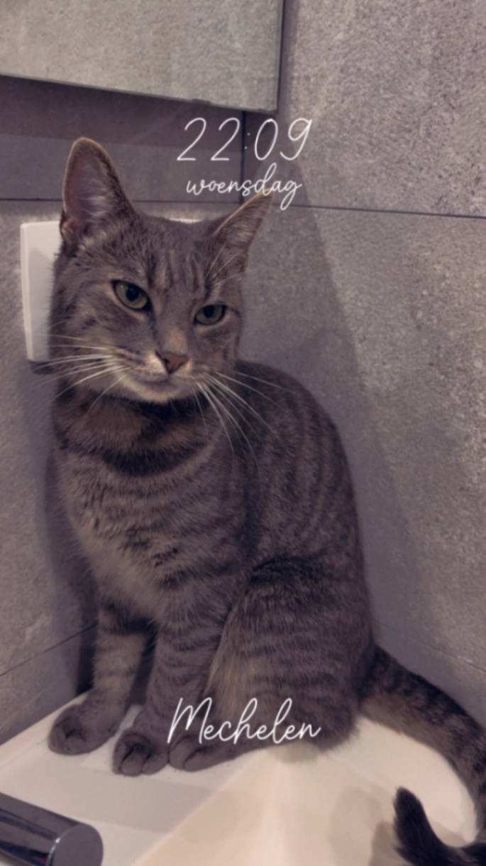 Lapjeskat, klein van gestalte. Opvallend ros vlekje op kin. Draagt grijs vlooien/tekenbandje. VERMIST sinds 5/2/‘26 te Battel (Mechelen)