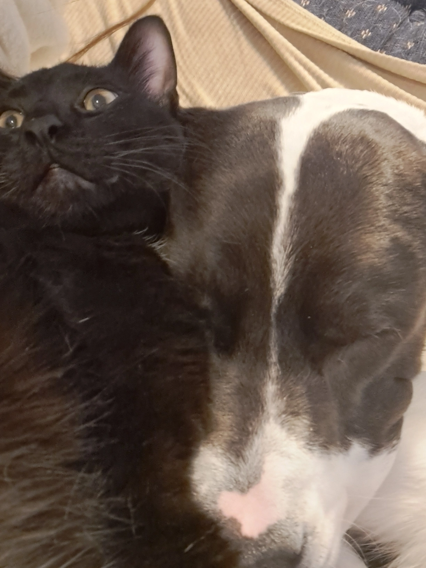 1 year old indoor male cat, healthy slim build, short black hair, yellowish/green eyes, black fur with small white spot on lower belly, friendly but probably scared