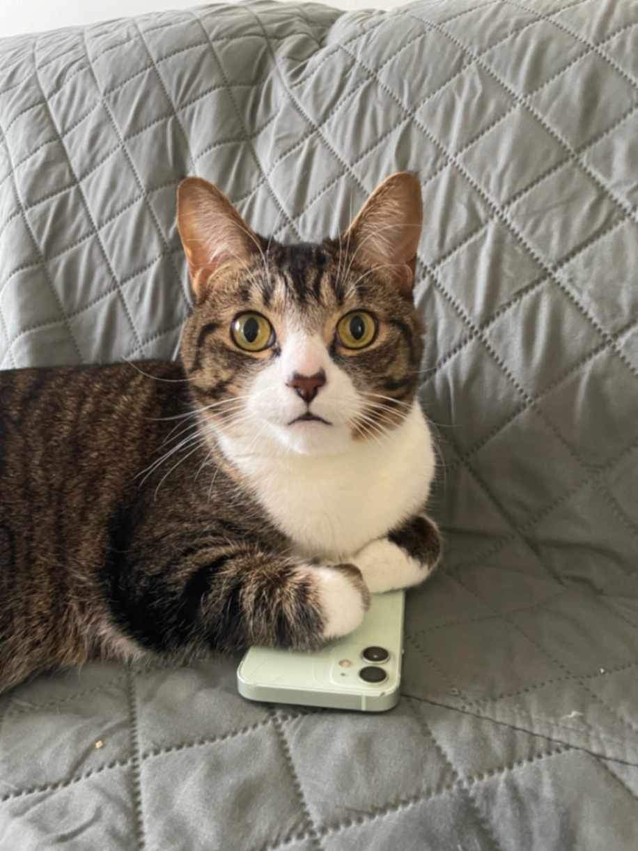 Female cat, doesnβt have her tag on (she has habit of removing her collar), friendly, grey and white tabby, has a BLACK SPOT on NOSE.