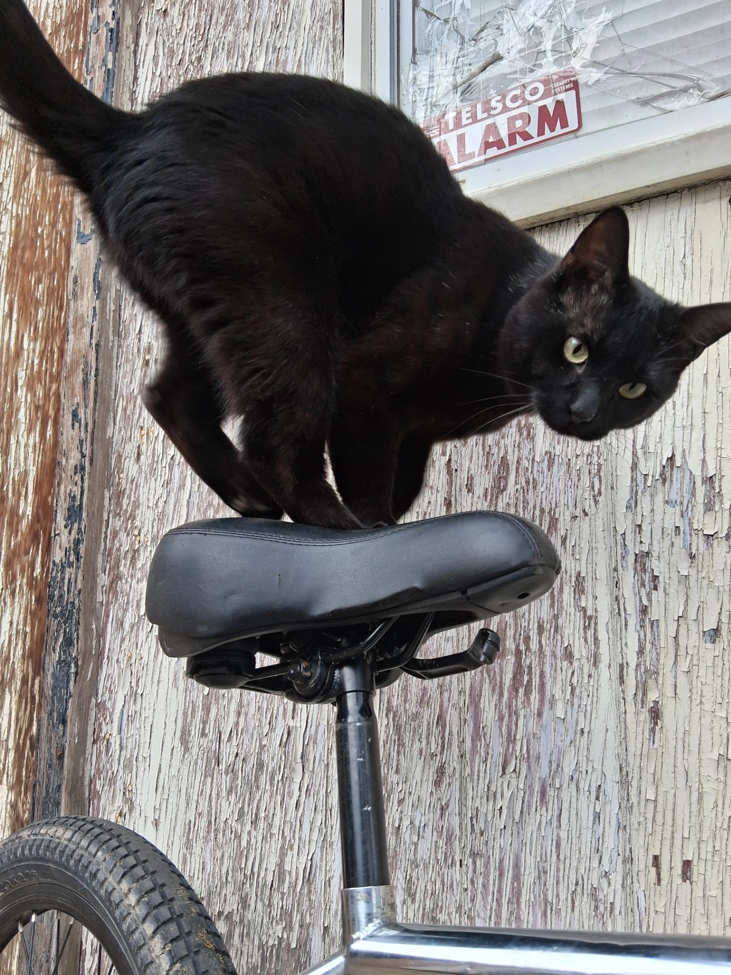 He's a male all black cat 2 years old with a bald spot on his shoulder hes always fighting other cats or dogs but is very friendly with humans