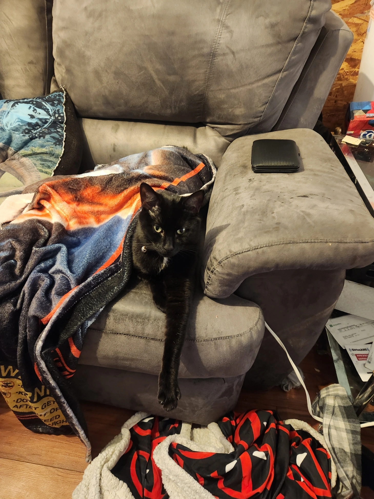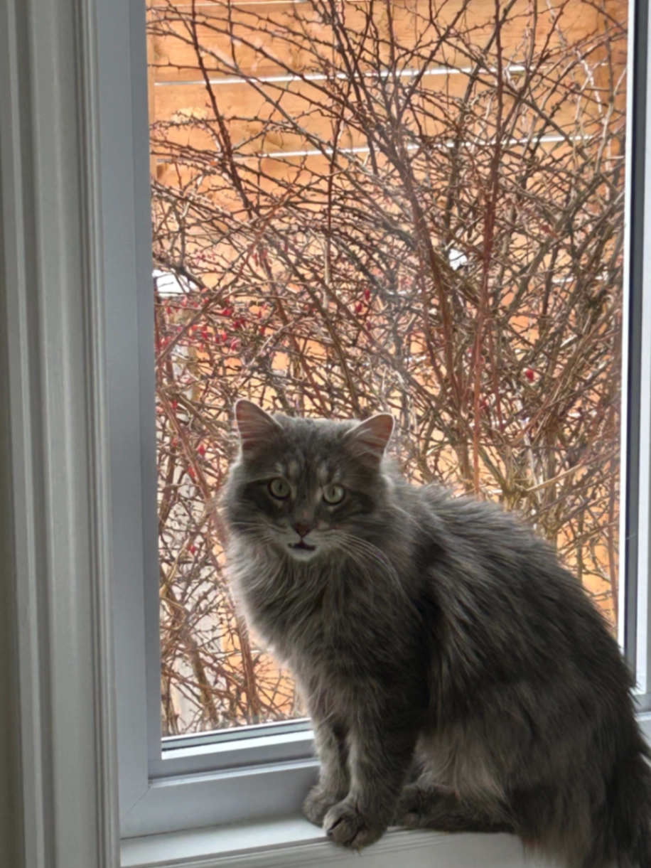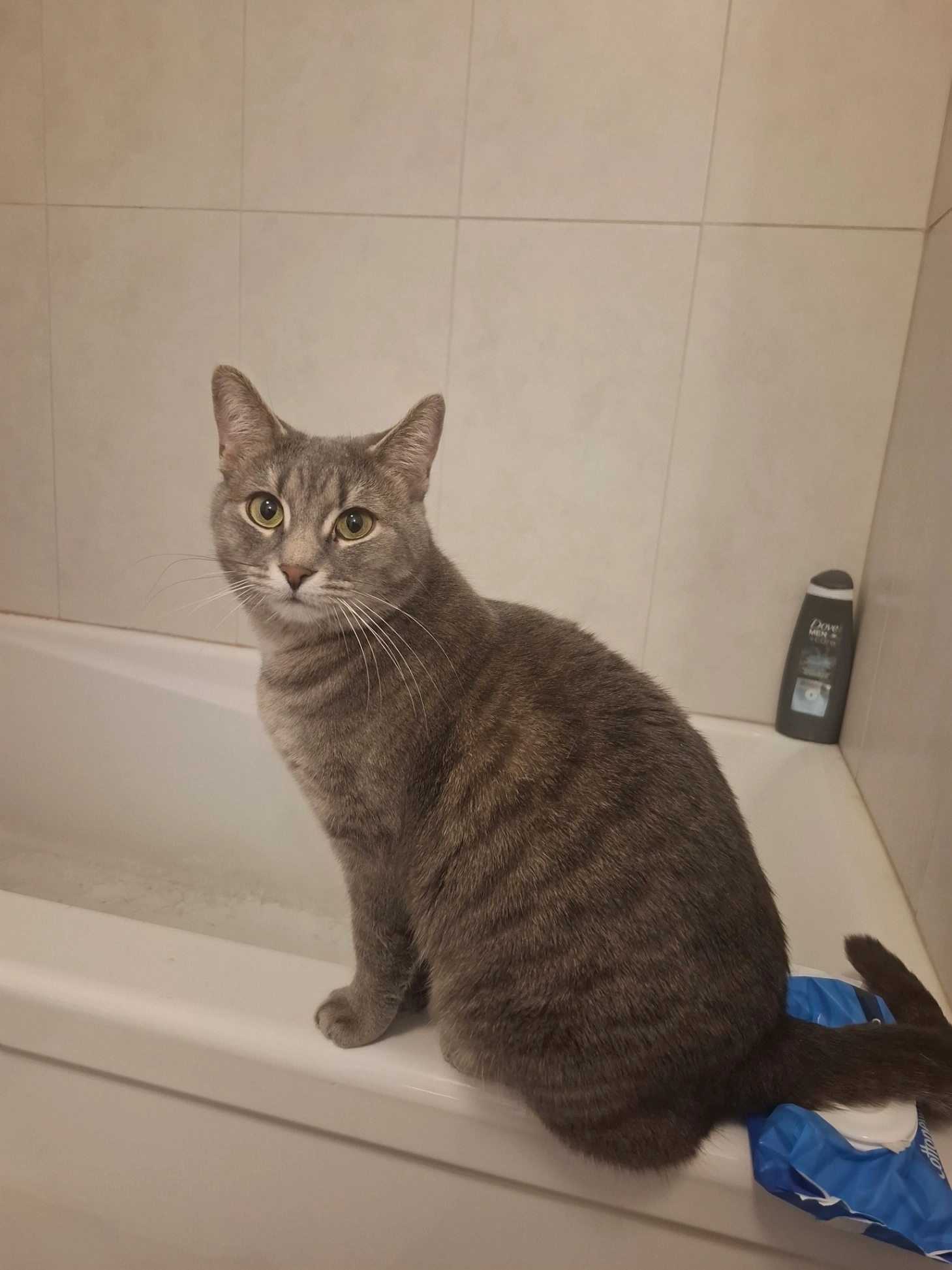 Plumeau est un chat gris de un an et demi, curieux, affectueux, ronronne quand on le prend.Aime les humains.