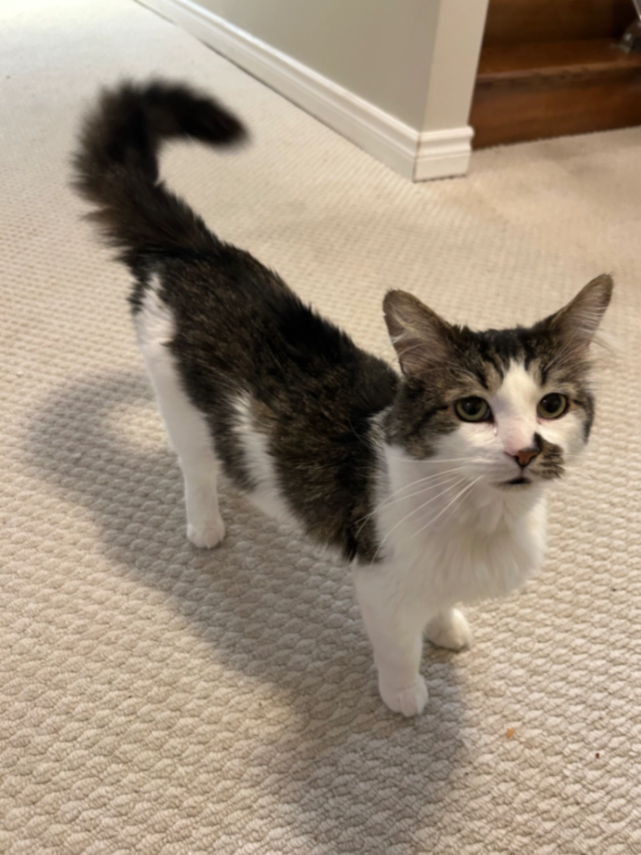 Folded- ear cat with round face, green eyes, white chest and paws, brown/orange tabby coat, and a striped tail. No collar or tag.