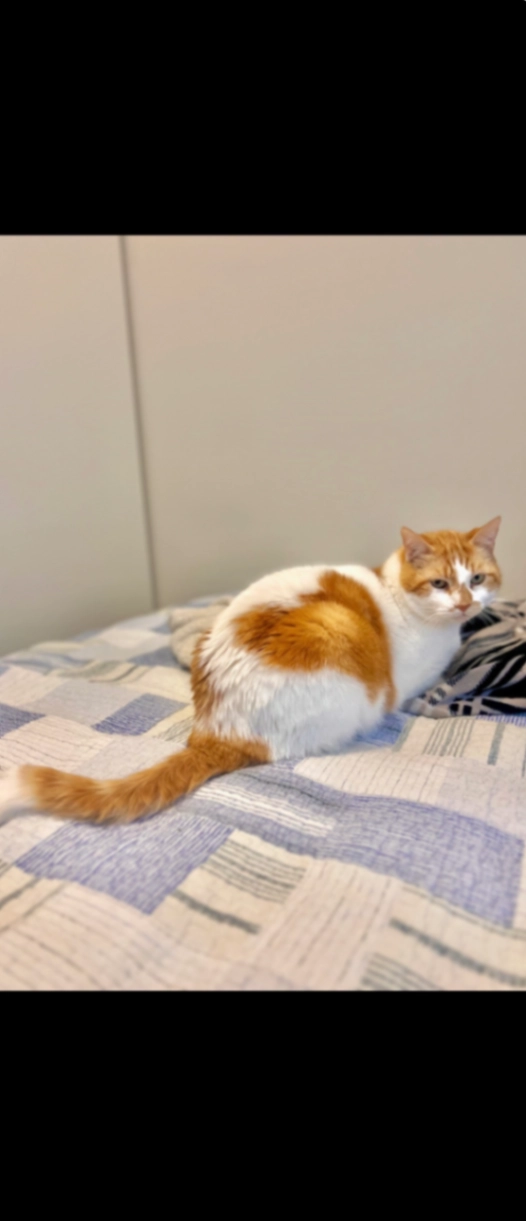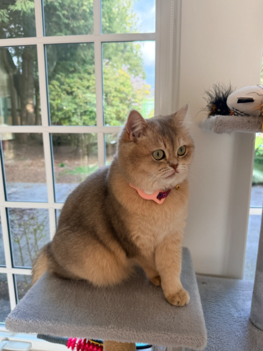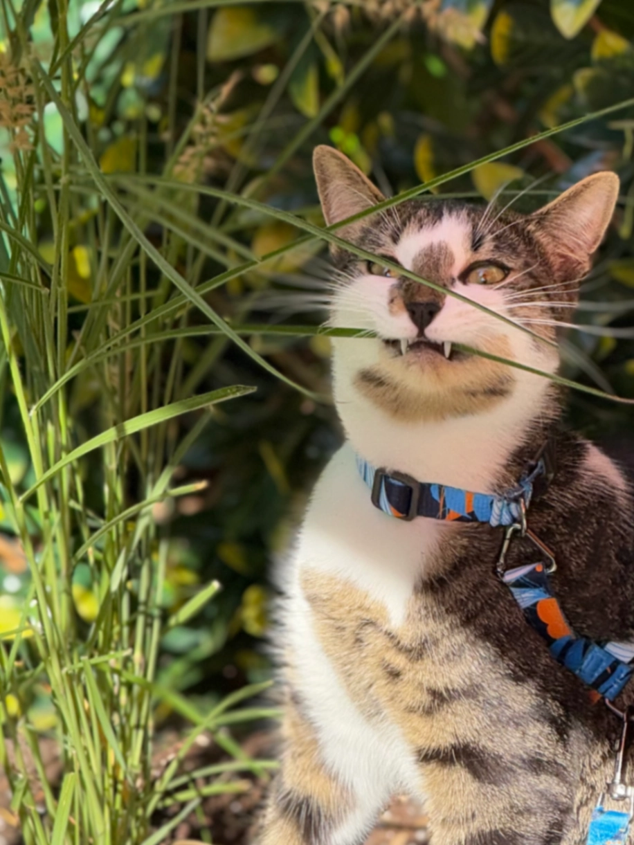 Cuddly cat that loves people and food. Strong dislike for dogs and coyotes.