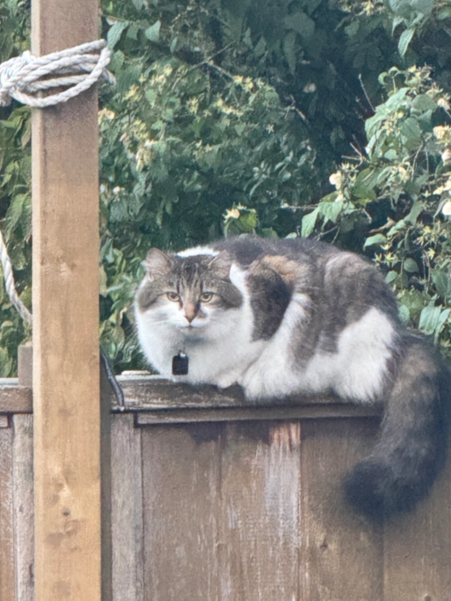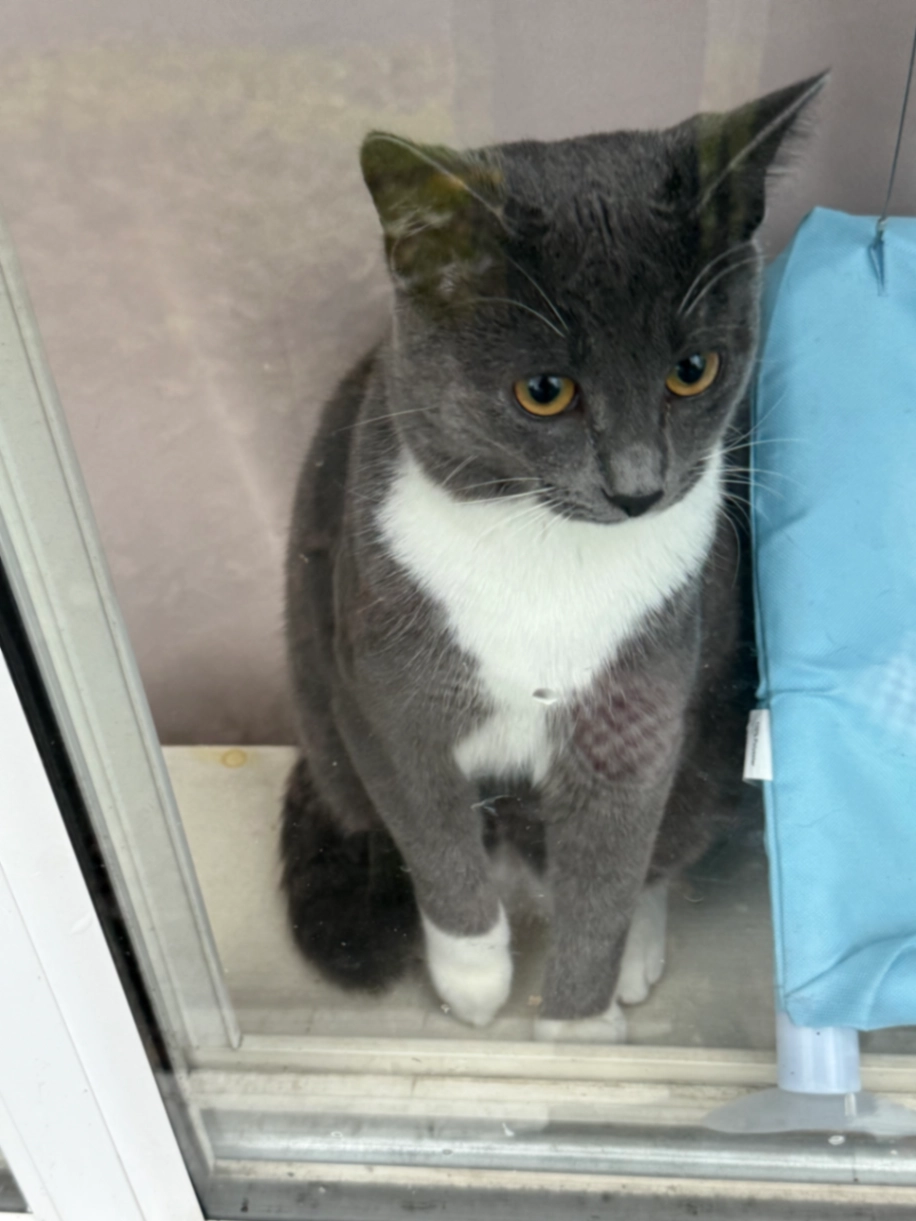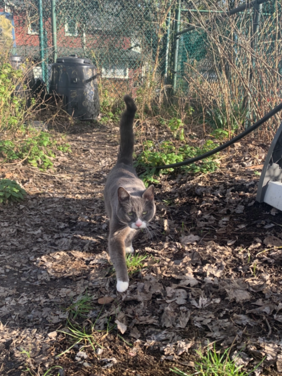 She is a small (5 lbs) senior cat and is gray and missing a part of her tail. She is also hard of hearing
