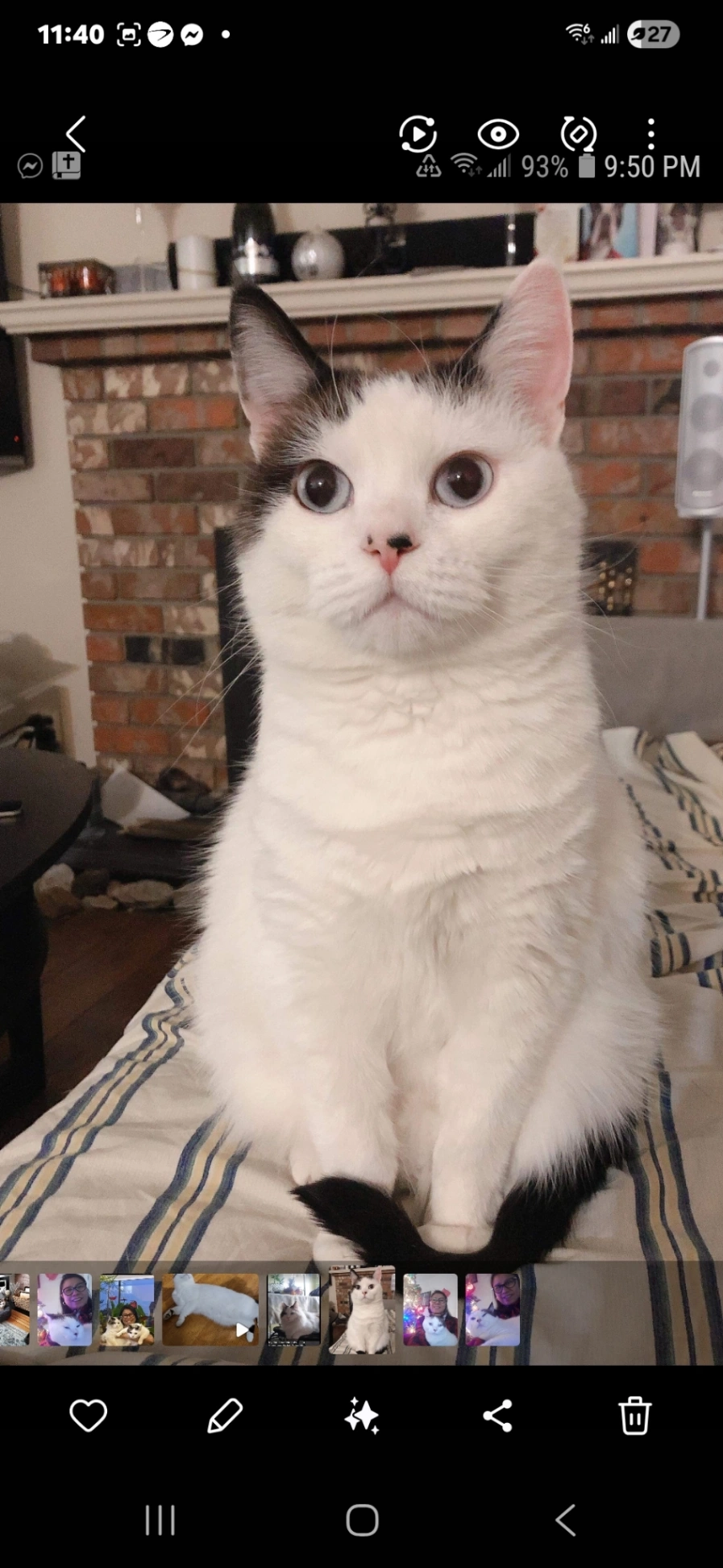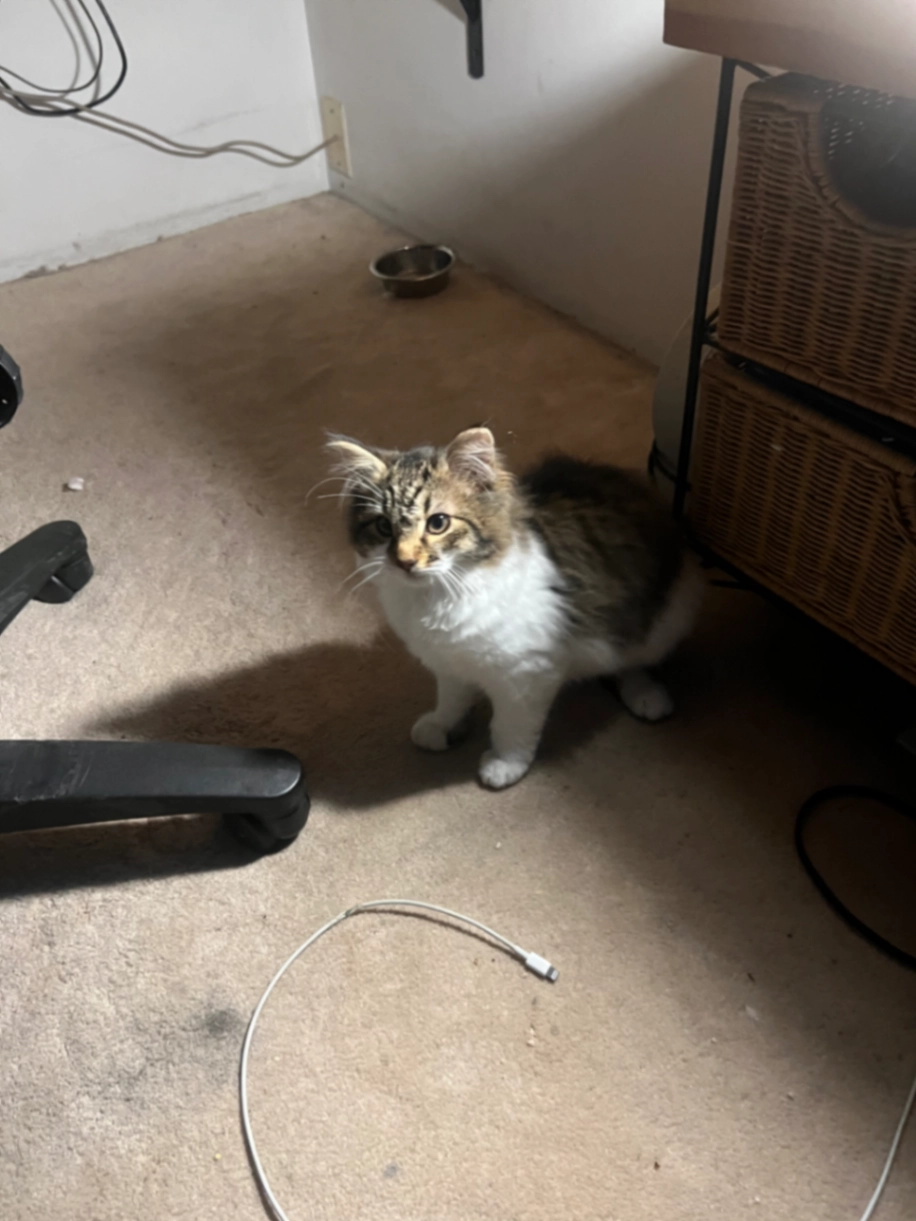 She is an indoor cat, about 10 years old, white fine fur with little brown and black combination on her fur and black mark on the tip of her nose. She is so gentle loving cat. Had a son with us with an outdoor one...