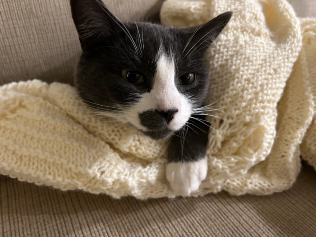 Skittish, tuxedo cat, black nose