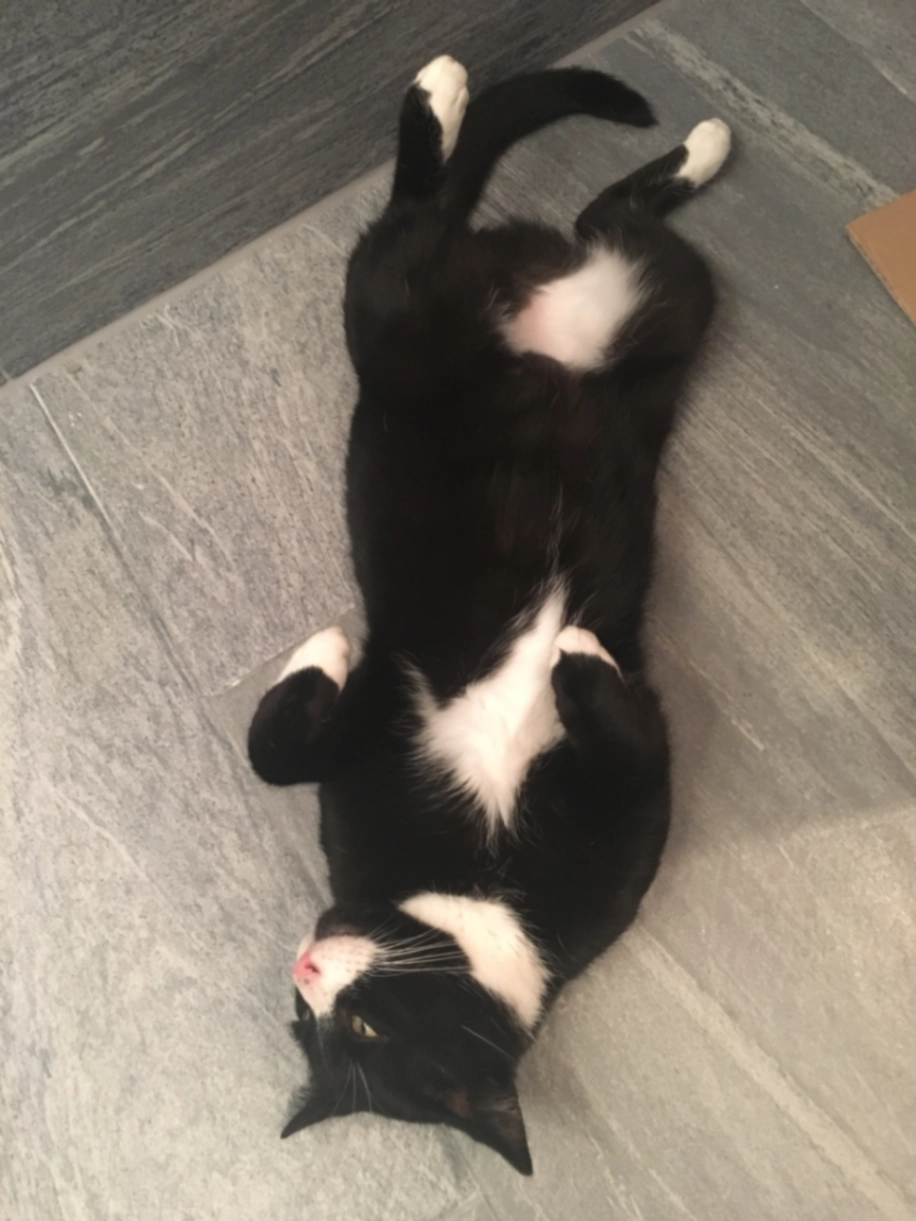 Es handelt sich um einen schwarz-weißen Kater mit markanter Zeichnung (weiße Brust, weiße Pfoten, weiße Blesse im Gesicht).
