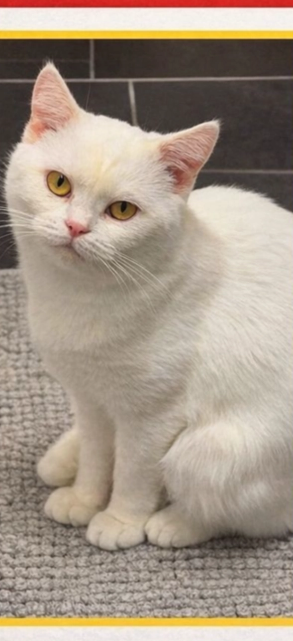 Ein Jahr und 5 Monate alt. Weiblich nicht sterilisiert. Schlank, komplett weißes Fell, gelbe Augen