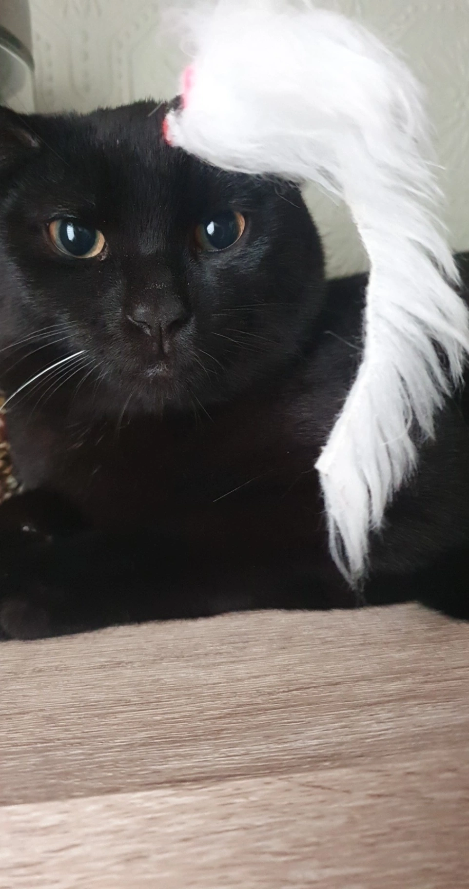 He is completely black with one white whisker. He is wearing a grey Seresto collar. He is approximately six months old.