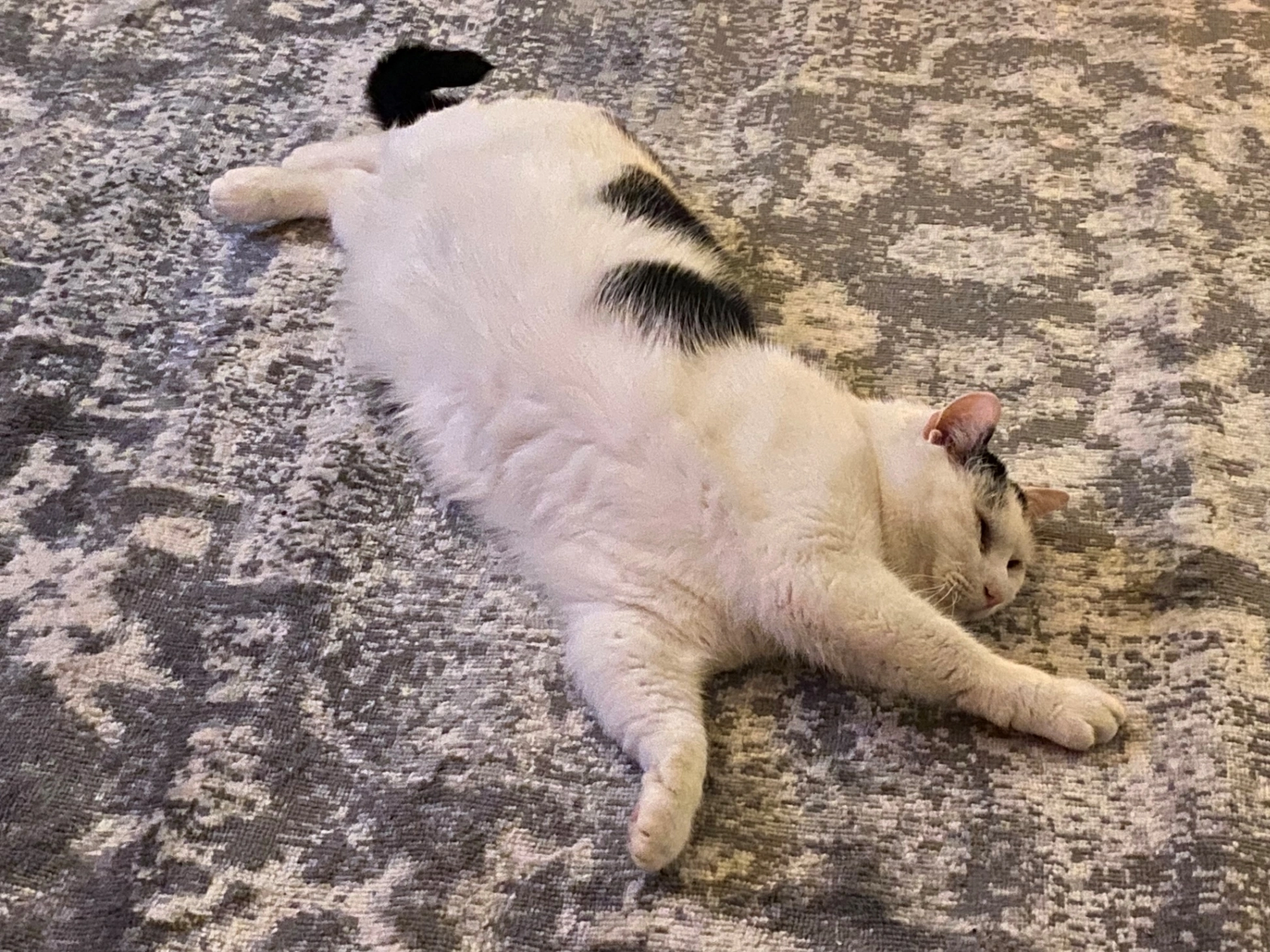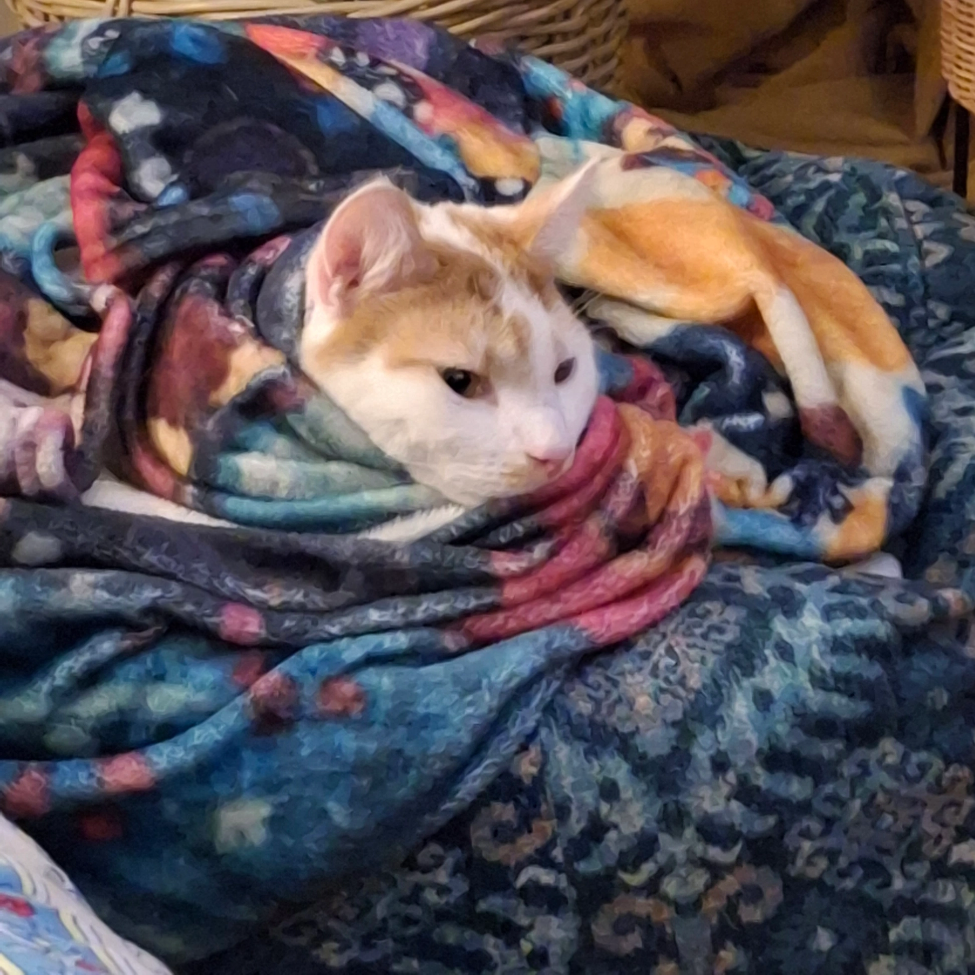 Hes two years old. Mostly white with orange markings.