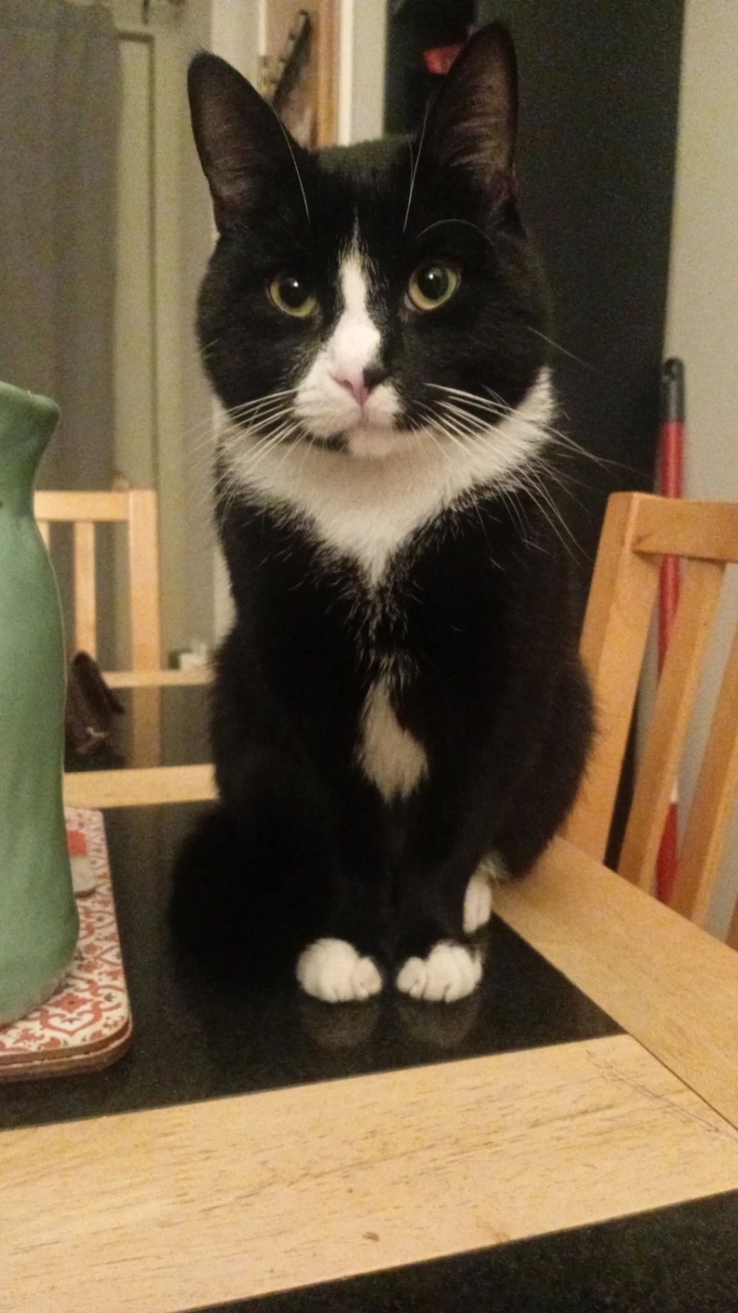 Black and white 1 year old male tuxedo cat not nuetured. No collar