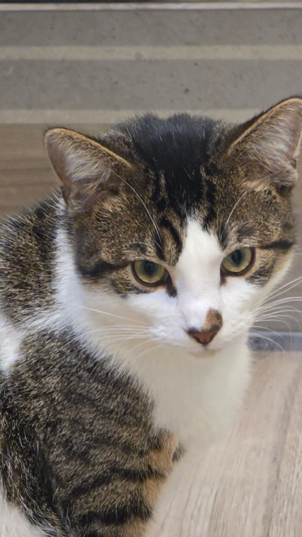 Leo is tabby and white with a brown smudge on half of his nose, microchipped, neutered and not wearing a collar.