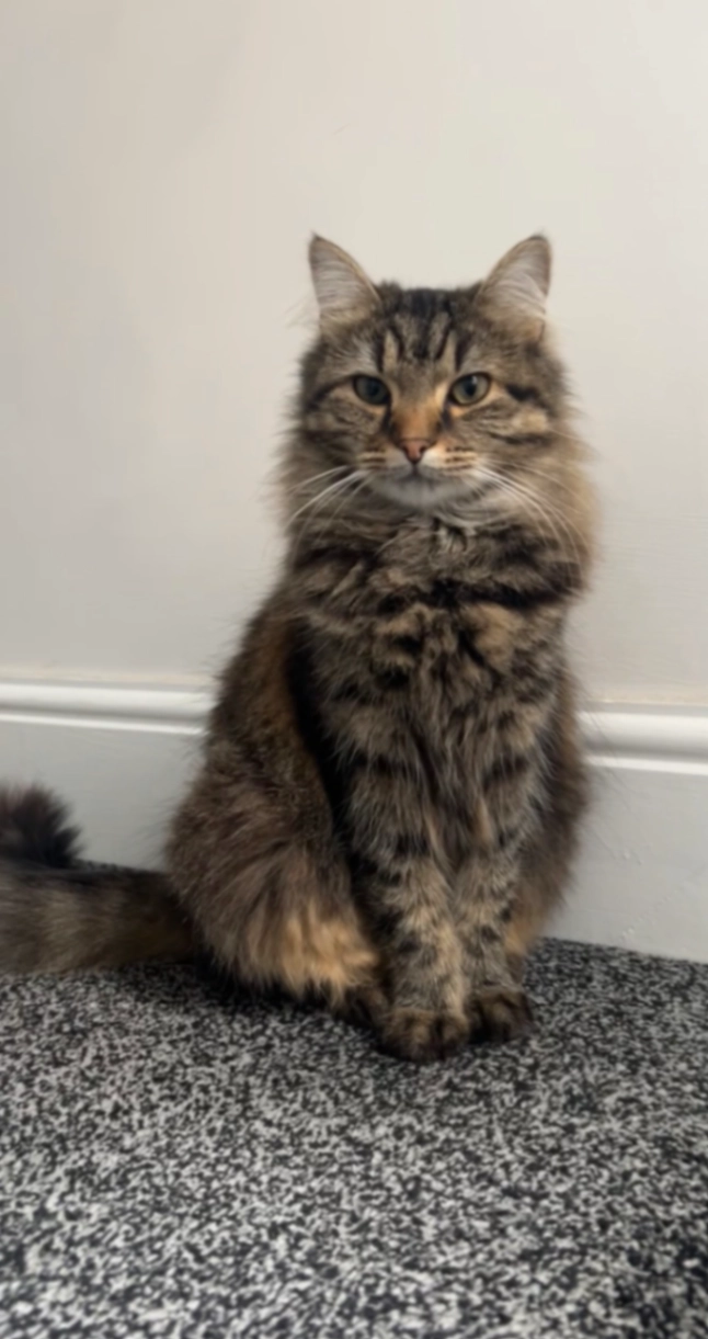 Yoko is a long-haired brown and grey tabby cat with green eyes, a pink nose, and a very fluffy tail. She has a lighter tan patch on her chest/belly. She’s gentle and shy, especially to strangers and she is more likely to watch than approach. She is microchipped, so if you do find her please take her to the vets so she can get scanned.