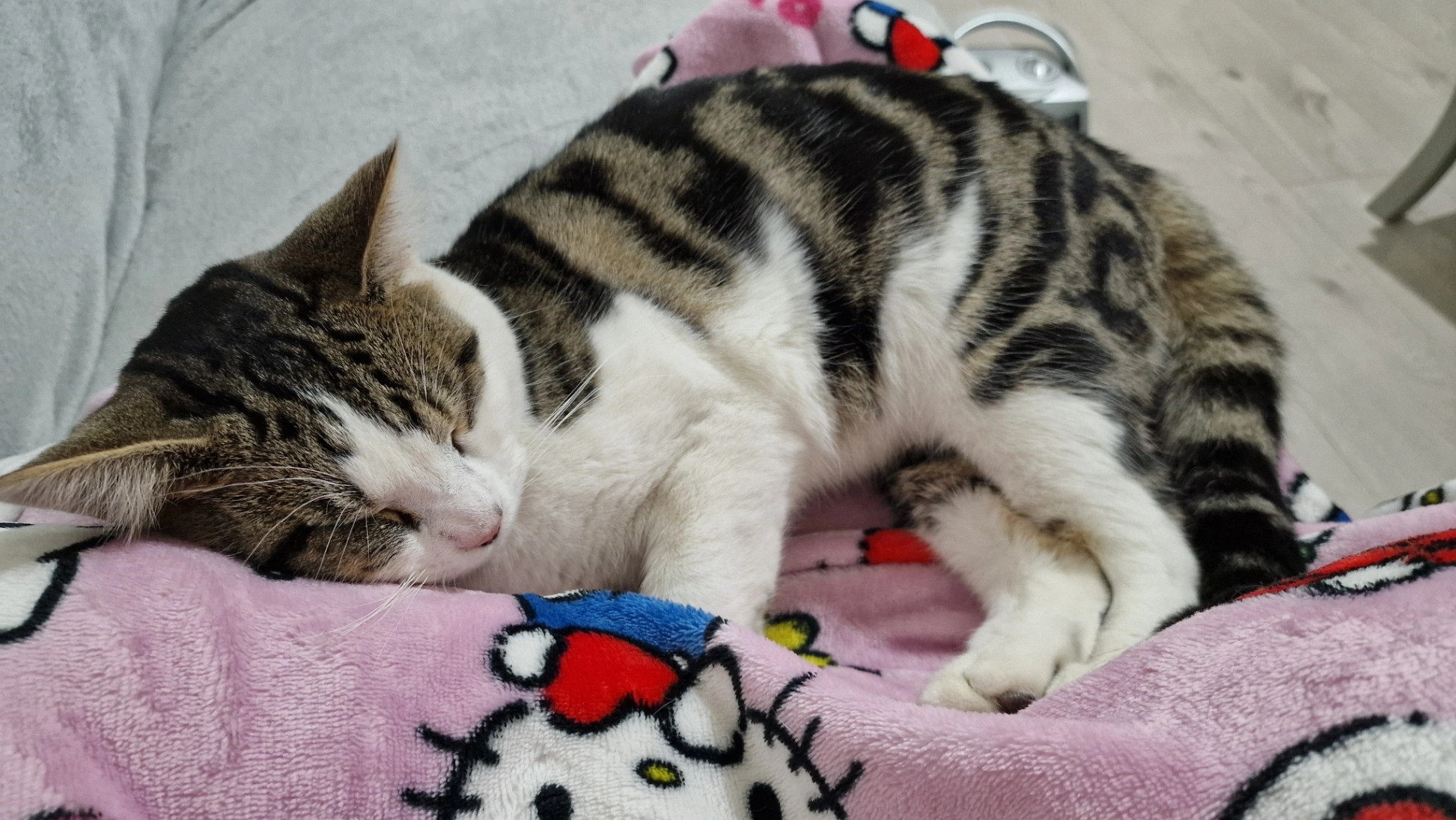 White cat with a brown tabby back and some tabby on his face too. hes got a small circle bit of tabby on his belly as well as some tabby parts on his legs/paw. he has a small black smudge on his nose and his eyes look like they have eyeliner on. hes a male cat but a super loving and social one.