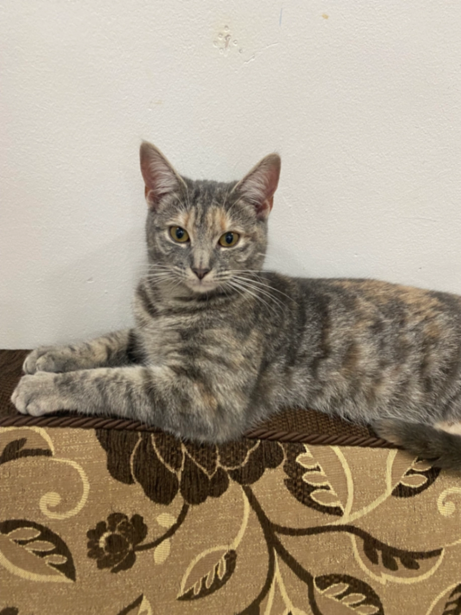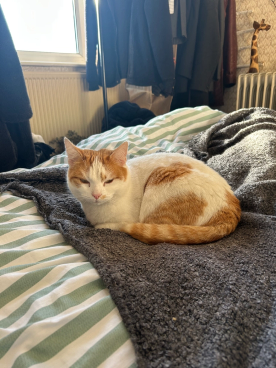 3 year old white & ginger female. Friendly but cautious so may not approach you if she’s frightened.