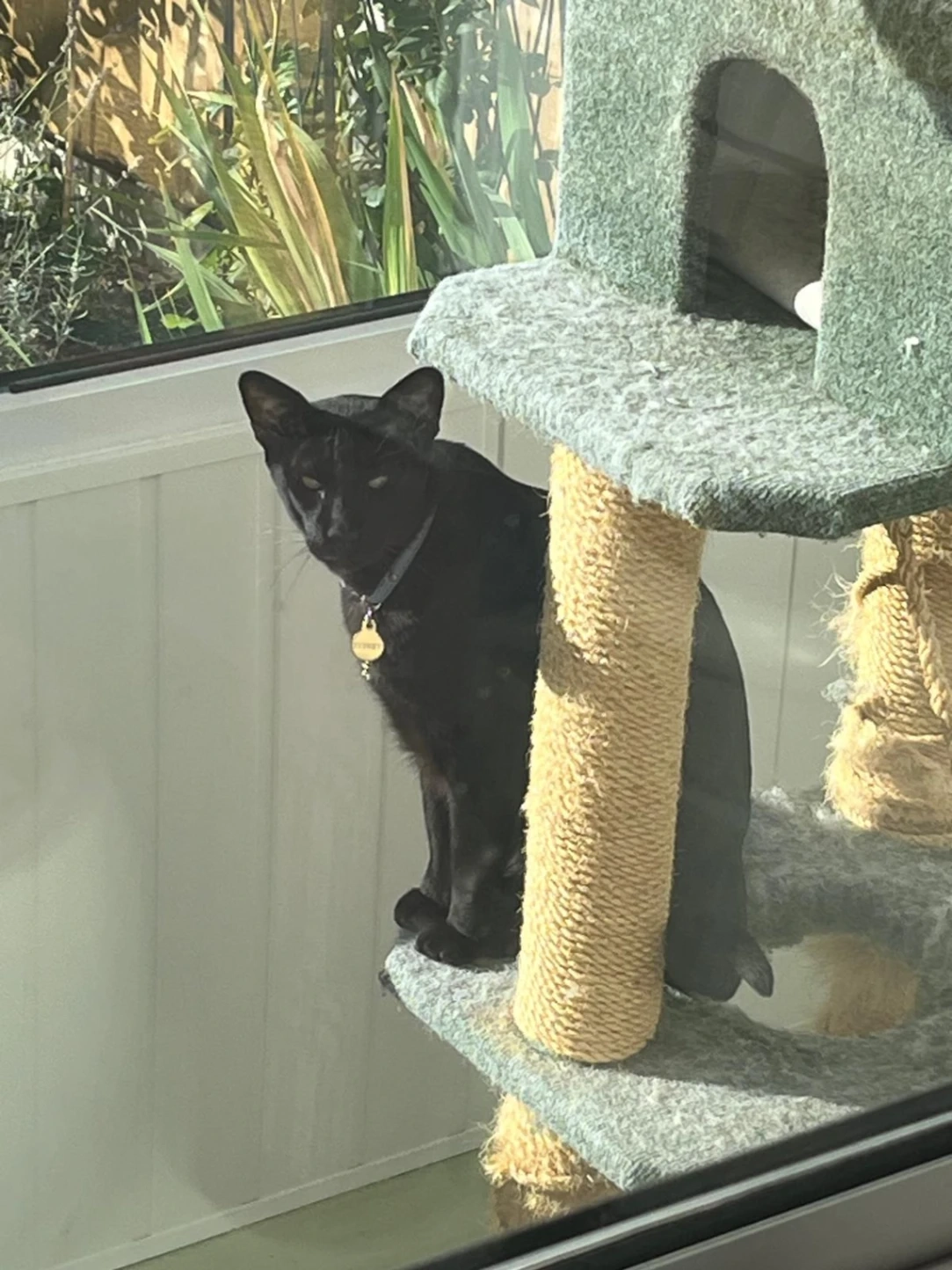 He's a black Oriental/Siamese. He is microchipped and wearing a collar with a fish bone skeleton tag.