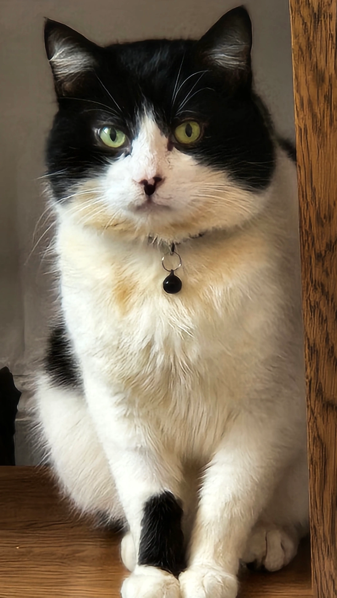 Black and white cat, black patch on his right foreleg, black tail, black marks on his nose, yellowish white coat on chest and forelegs.